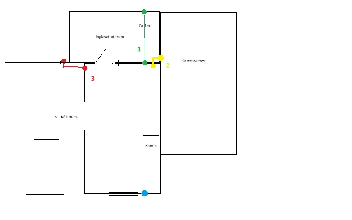 Problemet är placering av tilluft i vardagsrummet mot ena sidan där ytterväggarna är dels mot ett inglasad uterum på ca 4x4m och dels grannens garage, se skissad bild. Den blåa punkten är i alla fall var jag tänker mig att en tilluftsventil kan installeras (blå) där ytterväggarna är fria - men hur löser man den andra sidan där väggarna inte är fria?