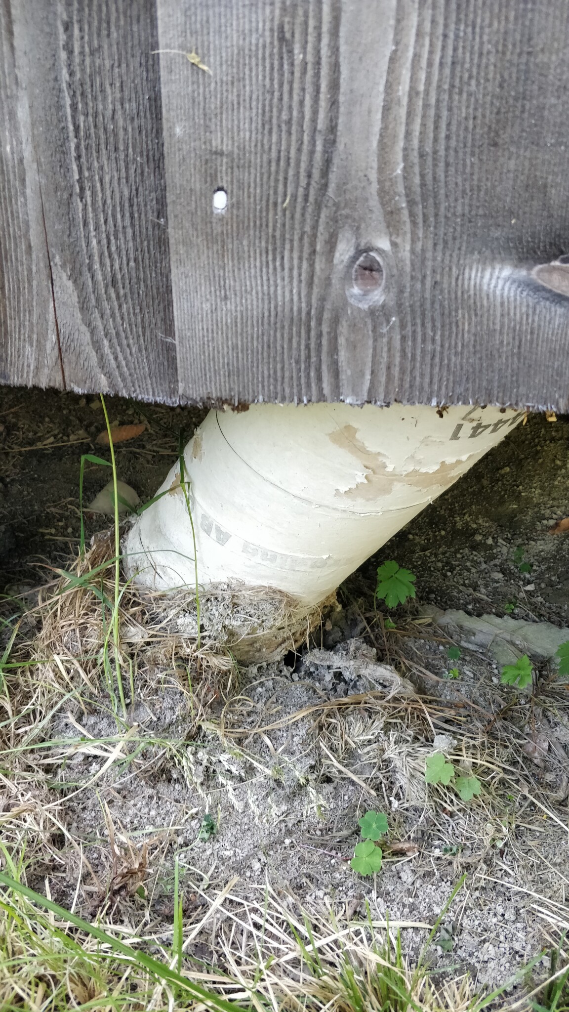 Tidigare ägare har gjutit tolv 15 cm diameter betongstolpar och placerat bjälkarna på dessa med stolpskor.
