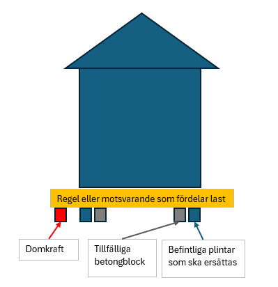 Om du kan komma åt att skjuta en kraftig balk eller regel hela vägen från ena sidan till andra så kan du palla upp med betongblock så den ligger dikt an undersidan av boden. Därefter kan du pressa upp med domkraft så att du avlastar gamla plintarna. Tryck inte mer än du behöver och var observant på rörelser i konstruktionen. Stick in skivor/skims mellan betongblocken och regeln så att du behåller den nya. När du gått varvet runt och gjort motsvarande lyft vid var och en av plintarna så kan du jobba säkrare med att lossa dessa, gräva bort och sätta dit rejälare plintar som går djupare och kanske även bredare. Har du lyft boden så den står i våg och regelvirke och betongblock inte står i vägen så kan dessa egentligen lämnas även när du fått dit nya plintarna. Se dock inte blocken som en ersättare till dina nya permanenta plintar.