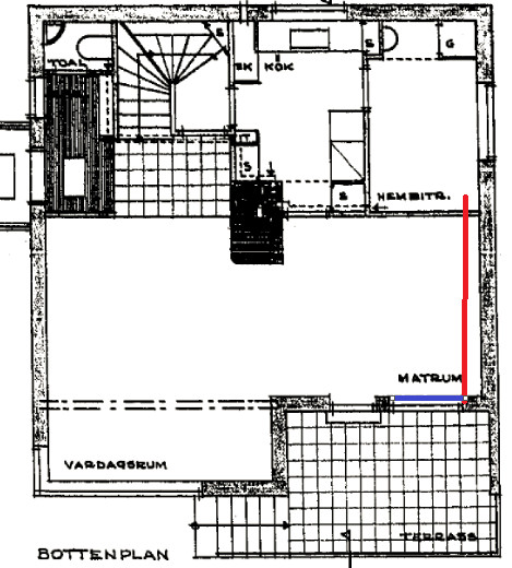 I köket har vi ett element vars två rör går rakt ned i golvet och dels två vertikala rör som går upp till element på övervåningen.