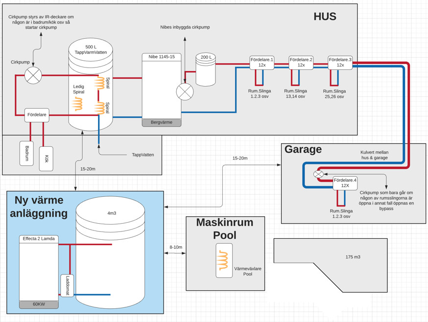 Det jag funderar över är hur man bäst dockar den nya lösningen till den befintliga, jag vill inte koppla bort den nya Bergvärmen, den är fin att ha och blir man lat så låter man bergvärmen köra vill man spara några slantar så kör man ved. Jag gjorde en snabb bild över hur systemet i grova drag ser ut idag, laddar upp den här. Vad är bästa sättet att koppla ny anläggning till ny pool och befintlig värmeanläggning.