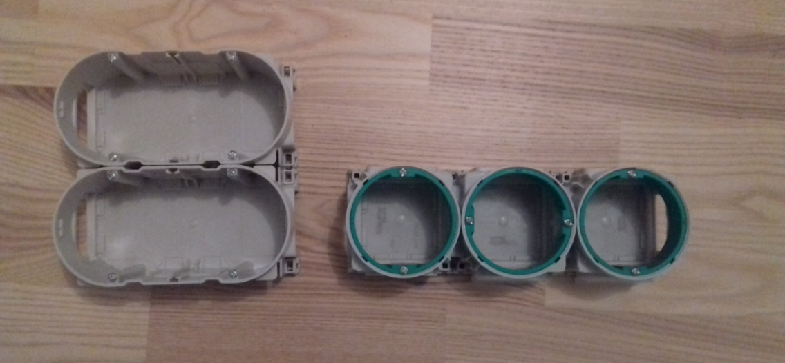 Håller på med väggen där tv:n sitter och på den sitter just nu tre stycken uttag bredvid varandra. Ett eluttag (tvåvägs), ett antennuttag (som jag inte använder men såklart tänker ha kvar ändå) och ett för nätverk.