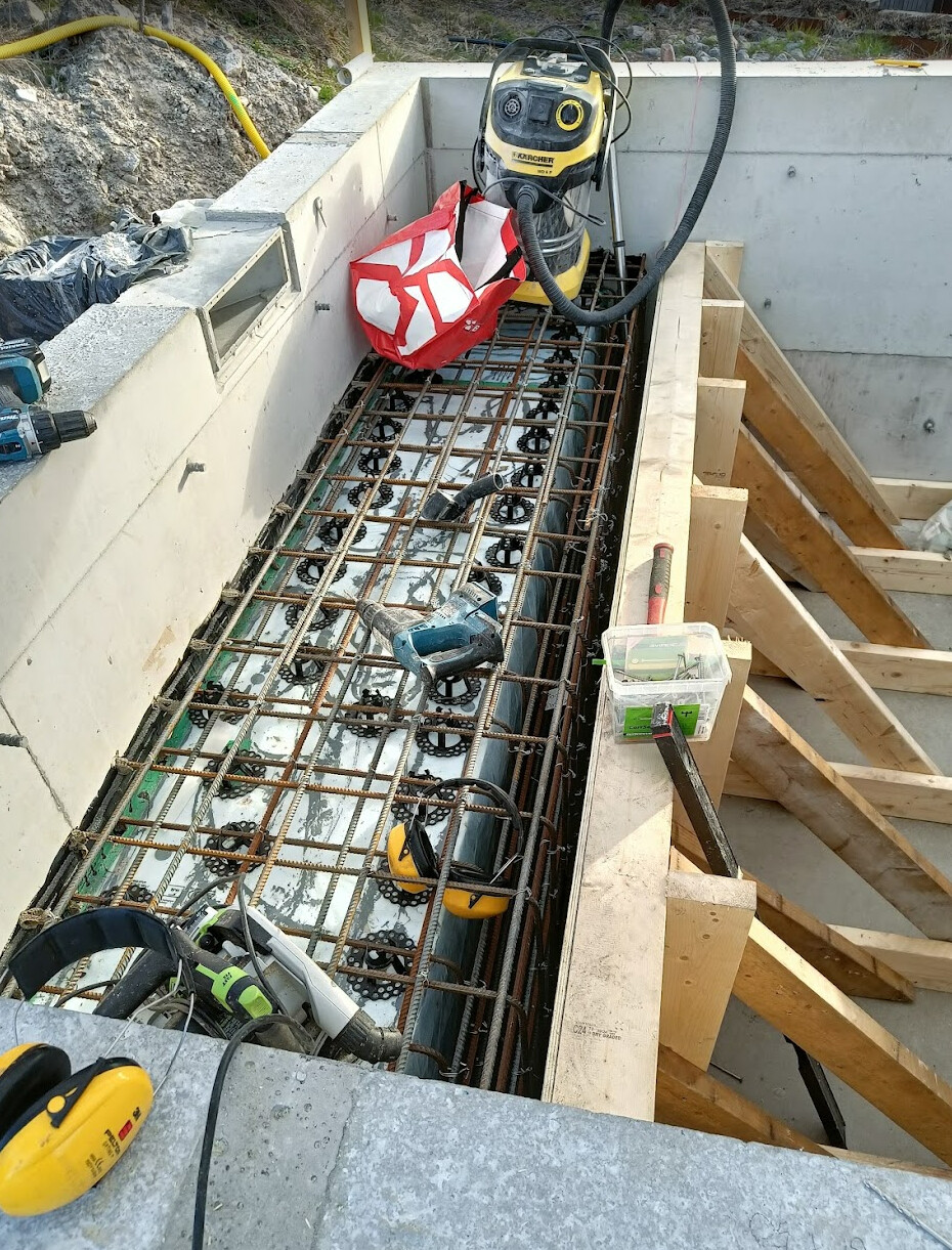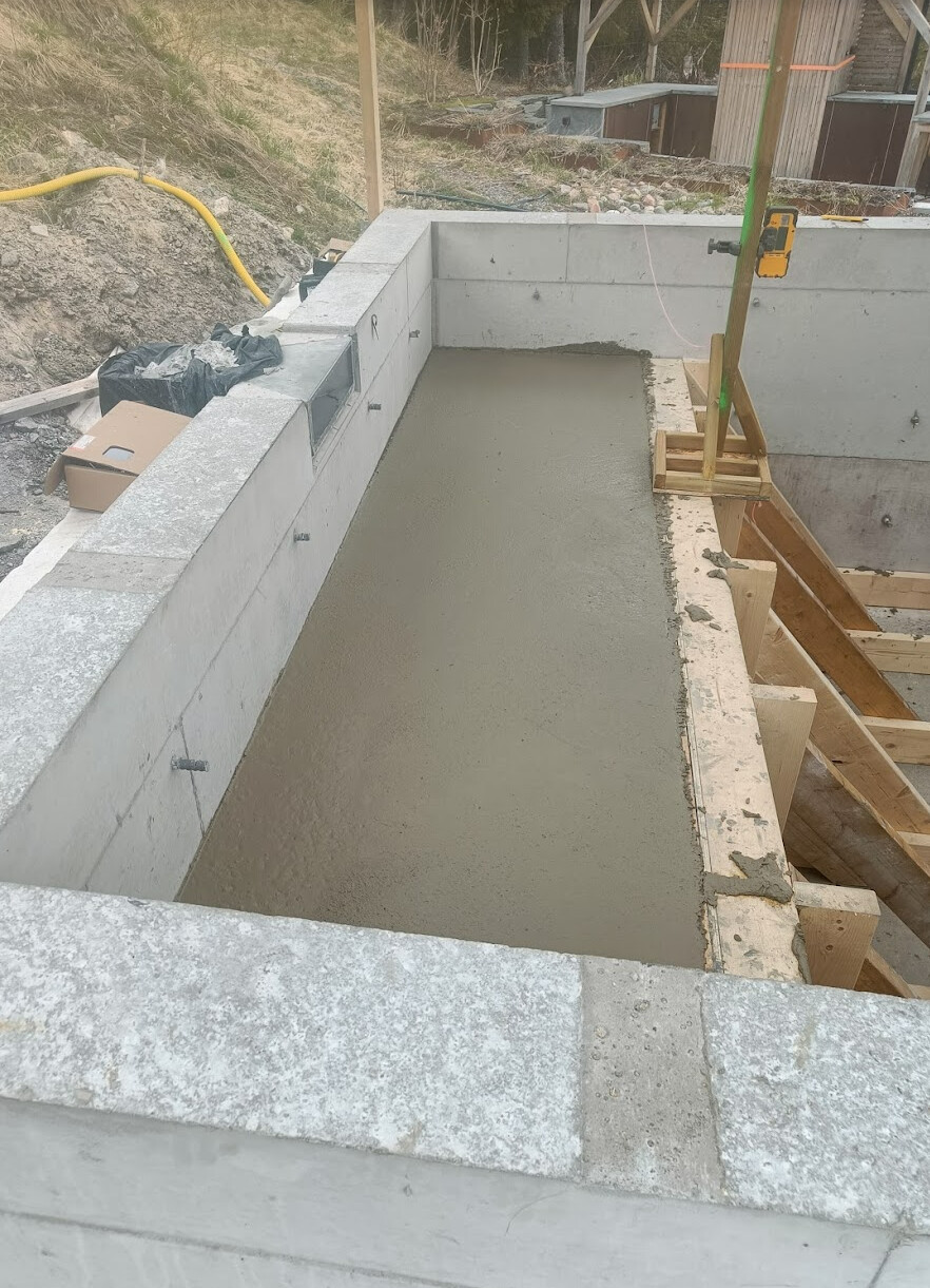 Jag har gjutit en liten pool om 3x3x1,5 meter. Poolen görts förra hösten men tyvärr gjöt jag en stor bänk längst ena sidan förra veckan. Mer om projektet finns här: https://www.byggahus.se/forum/threa...vattentaet-betong.516678/page-11#post-6227167