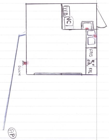 Stugan där vi ska ha vatten är en 15 kvm frigga som innehåller kök och toa. (Idag förbränningstoa) alltihop byggt med en viss tanke på kommande VA. Stugan står på plintar och det är ganska trångt under - med guds hjälp och en tandborste ska vi nog kunna gräva oss in mellan plintraderna ungefär där jag ritat på den bifogade skissen...