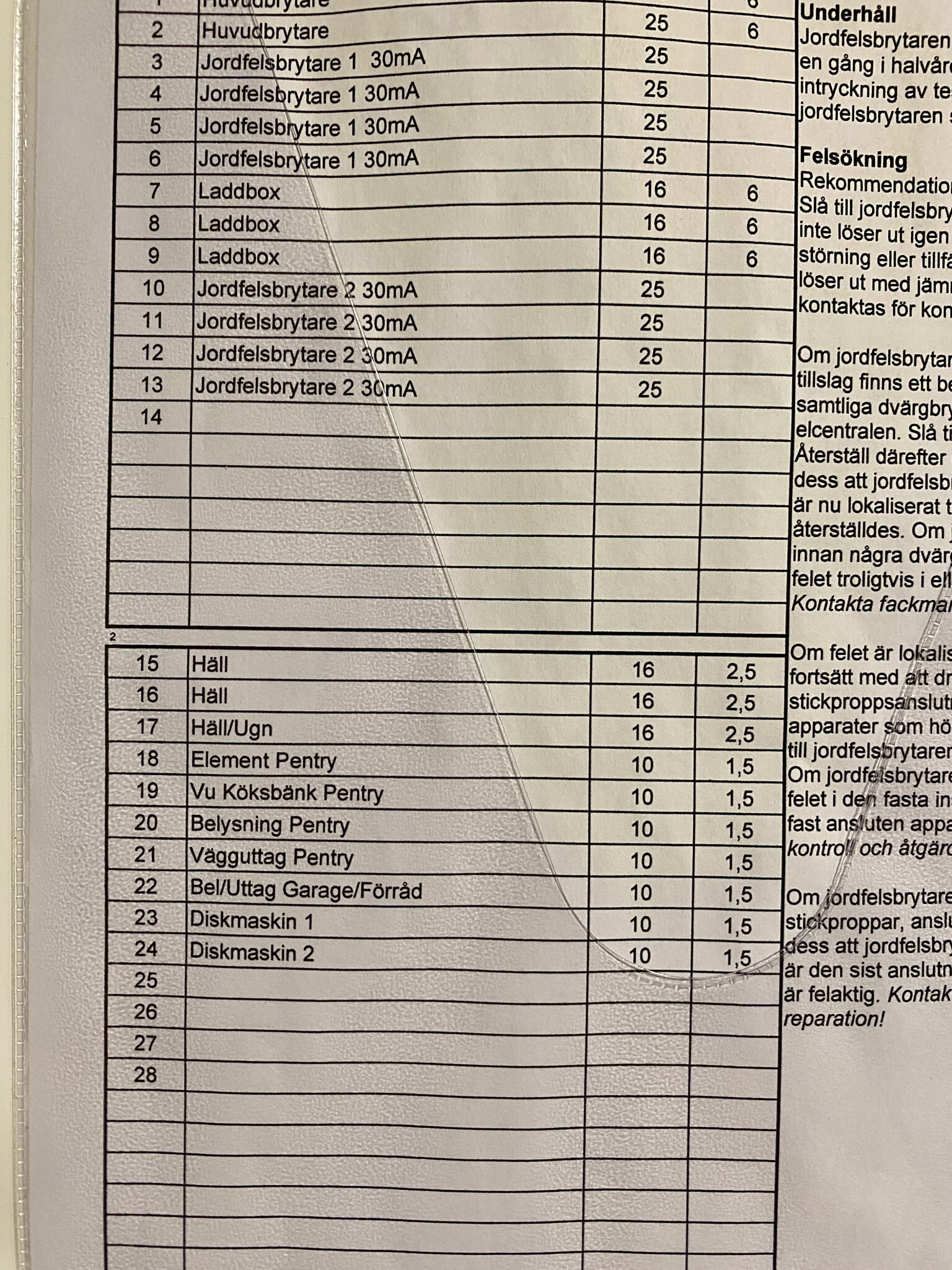 Jag har undrat vad dvärgbrytare 25 och 26 gör, de är inte beskrivna på gruppförteckningen och verkar vad jag kan se inte ha någon fas kopplad. Däremot är de kopplade till jordfelsbrytaren.