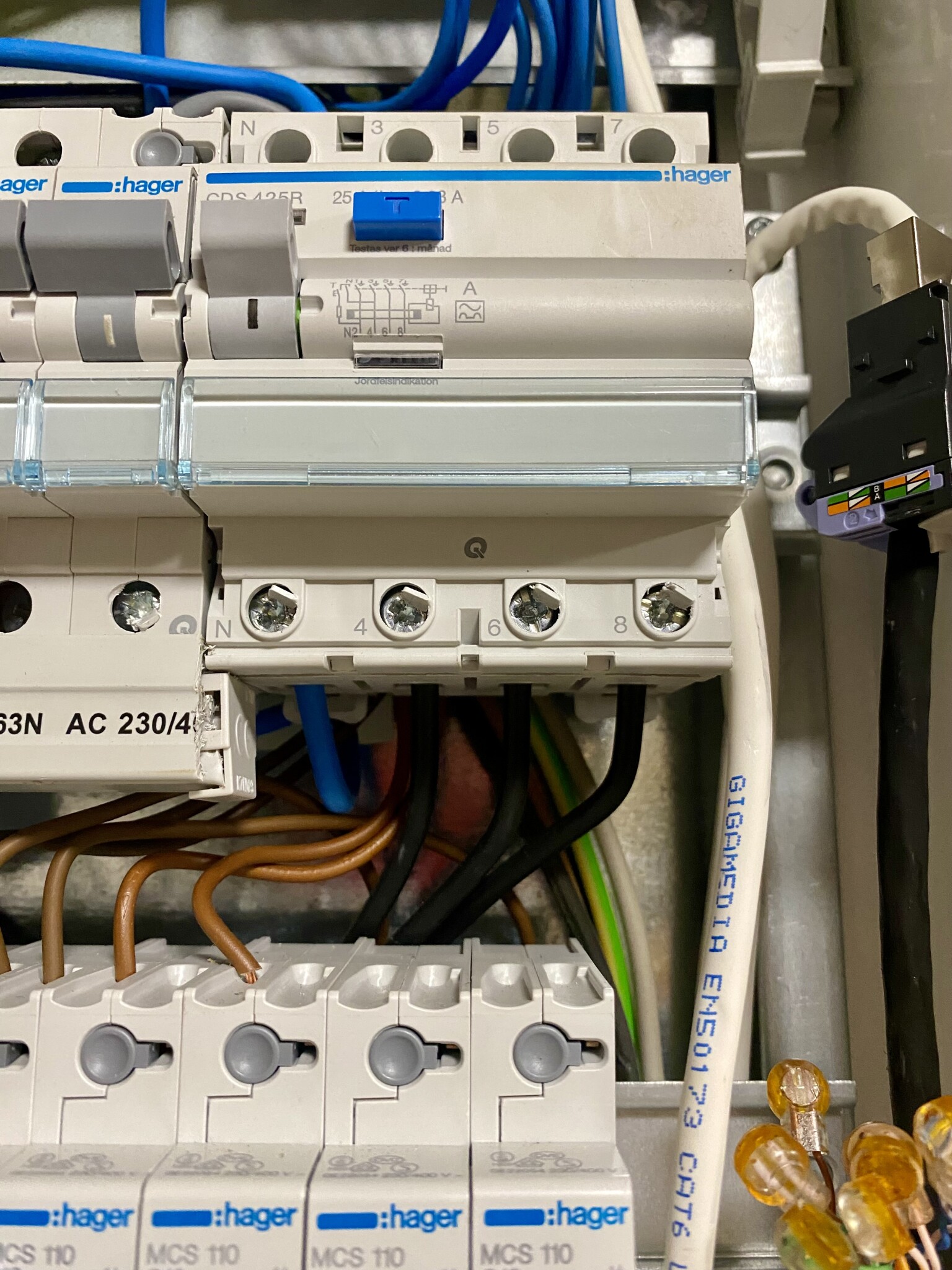 Och när det kommer till dom svarta ledarna är detta matningen till nedre raden, jordfelsbrytaren skyddar samtliga säkringar i nedre rad medan den övre har egen jordfelsbrytare. De flesta säkringar idag har intag för både fasskena och ledare. Men på vissa äldre modeller måste man trycka in både ledare och fasskena i samma lilla terminal. Men man måste alltid sy emellan raderna på något sätt.