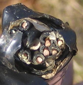 En tjock svart kabel med 4 relativt grova kopparkablar inuti, det gissar jag är el.