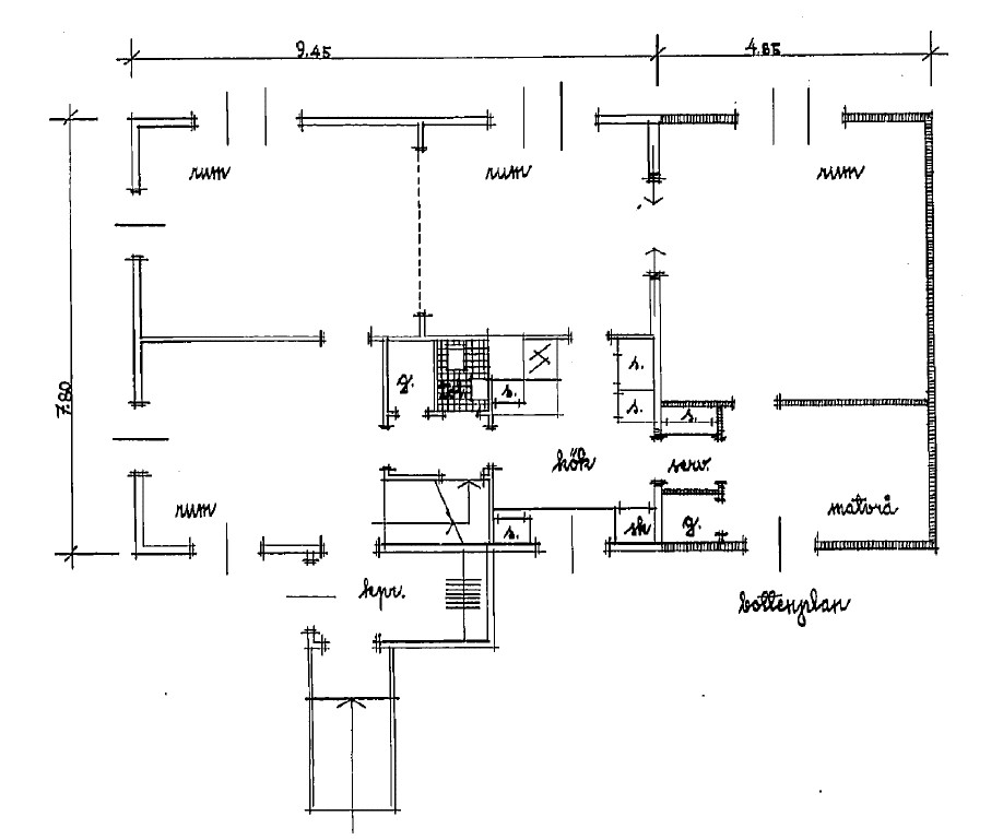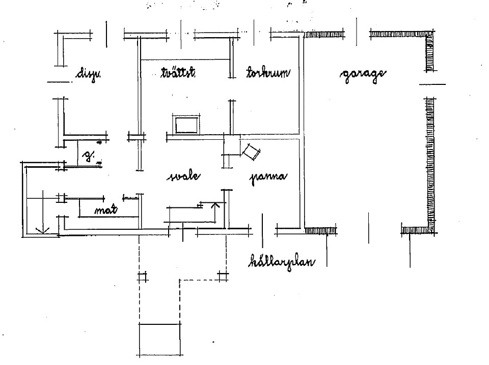 Jag har bifogat ritningar från 50 talet (då officiellt tillbyggnad gjordes), en del ändringar är gjorda men i stort sett är de flesta väggarna är kvar.