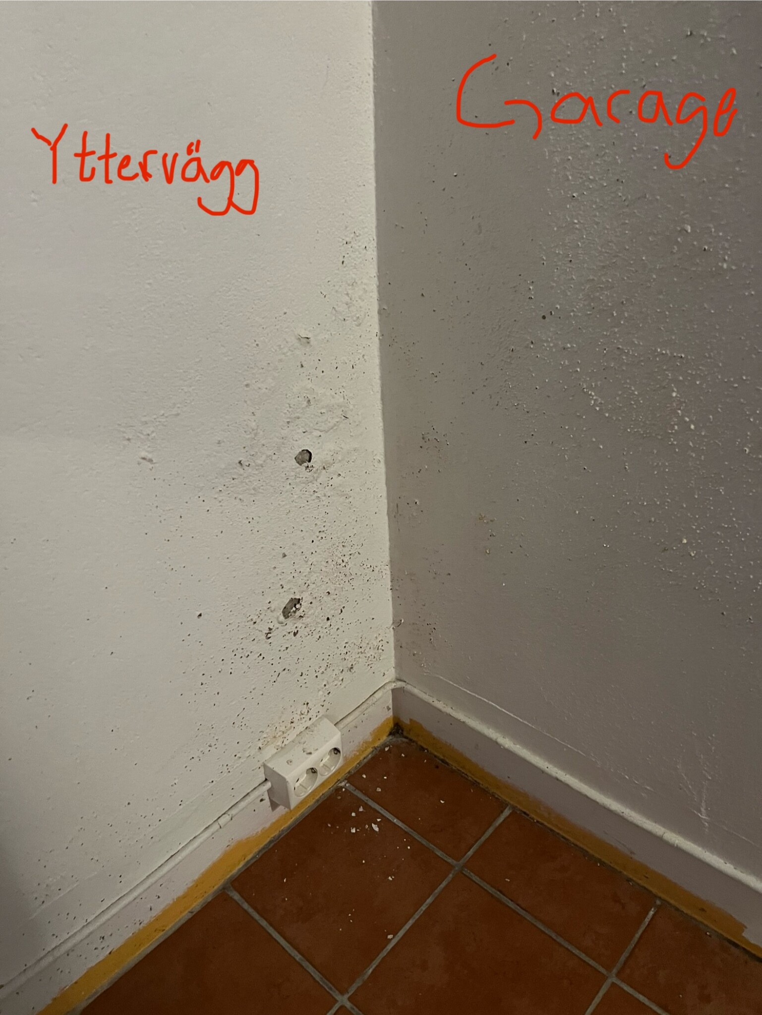 • Hörnvägg med bubblor i putsen, etiketterad "Yttervägg" och "Garage", med en eluttag under och orange klinkergolv.