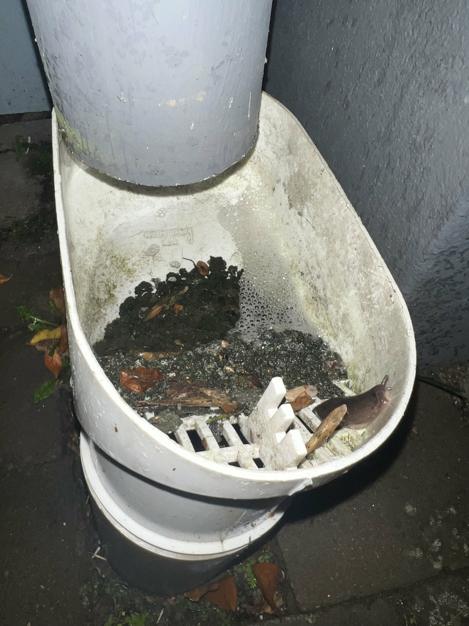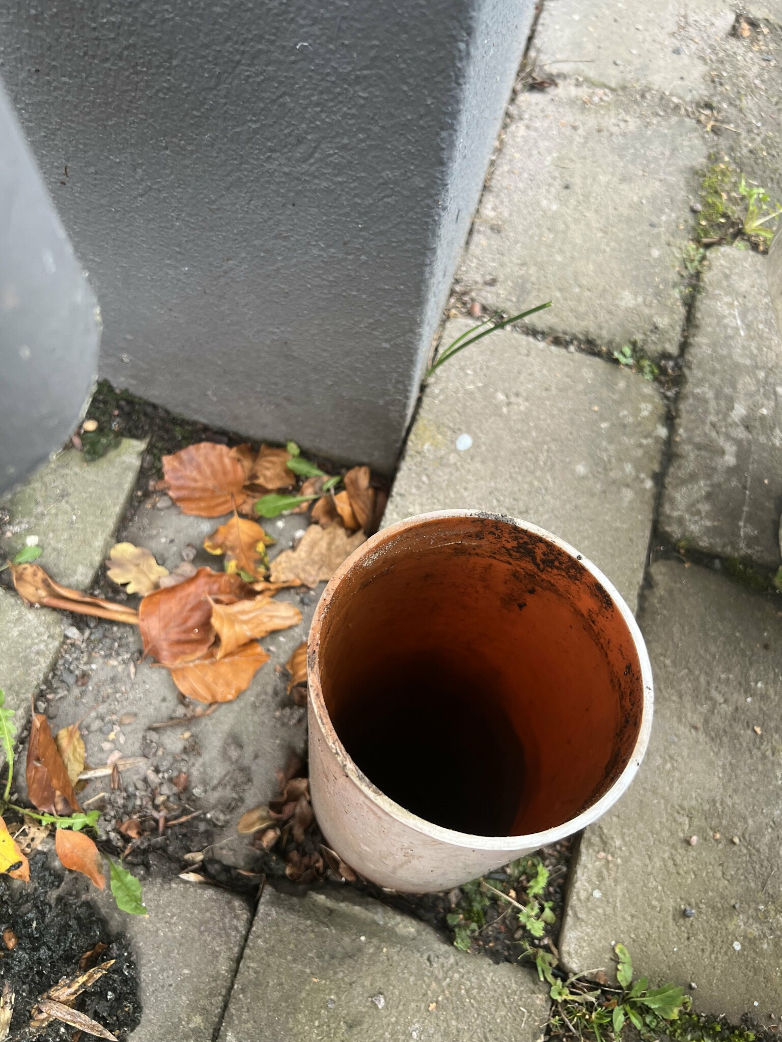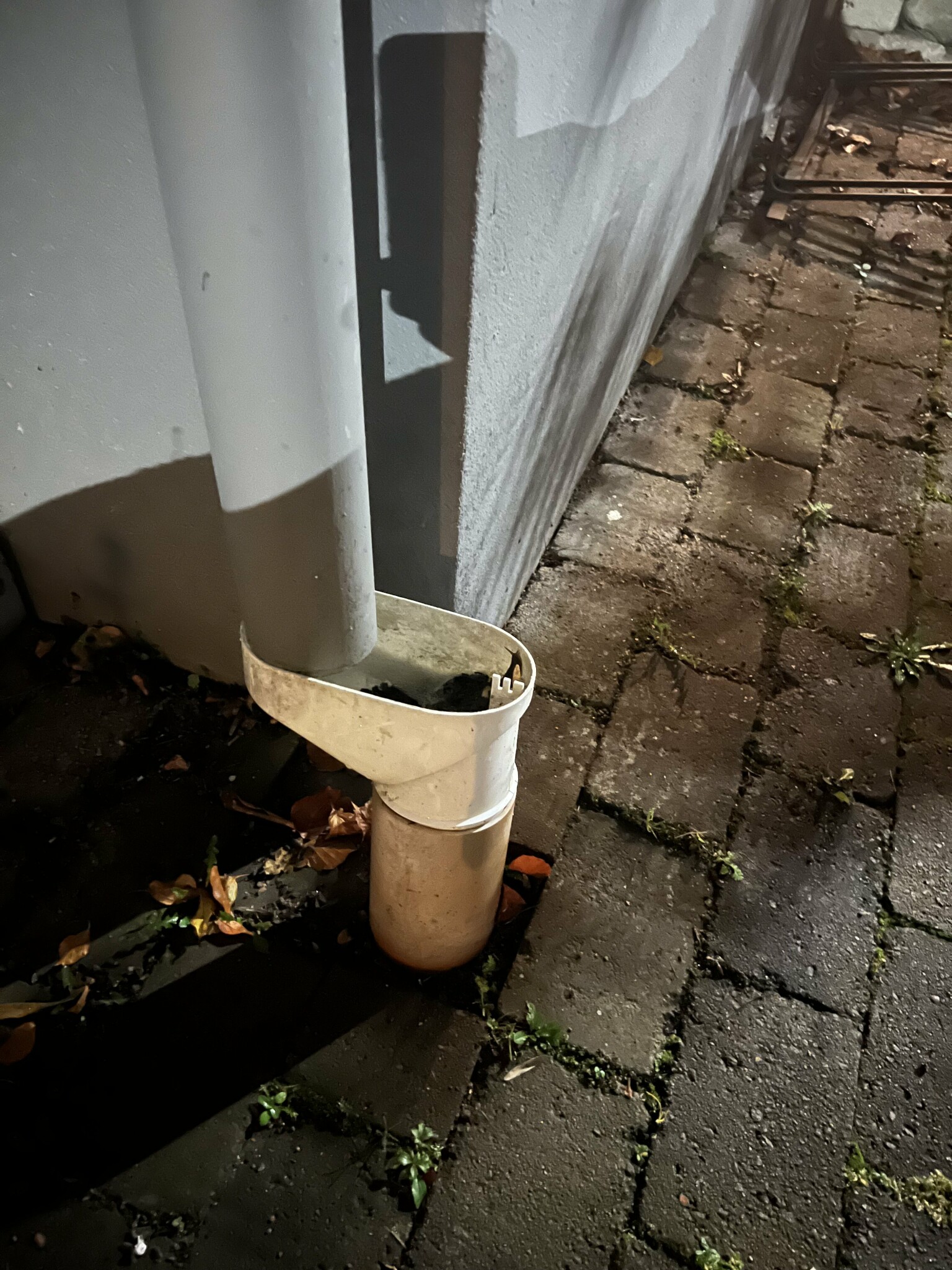 • Vitt rör som leder till en plastbehållare med smuts och löv, misstänkt för stopp.