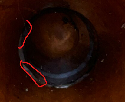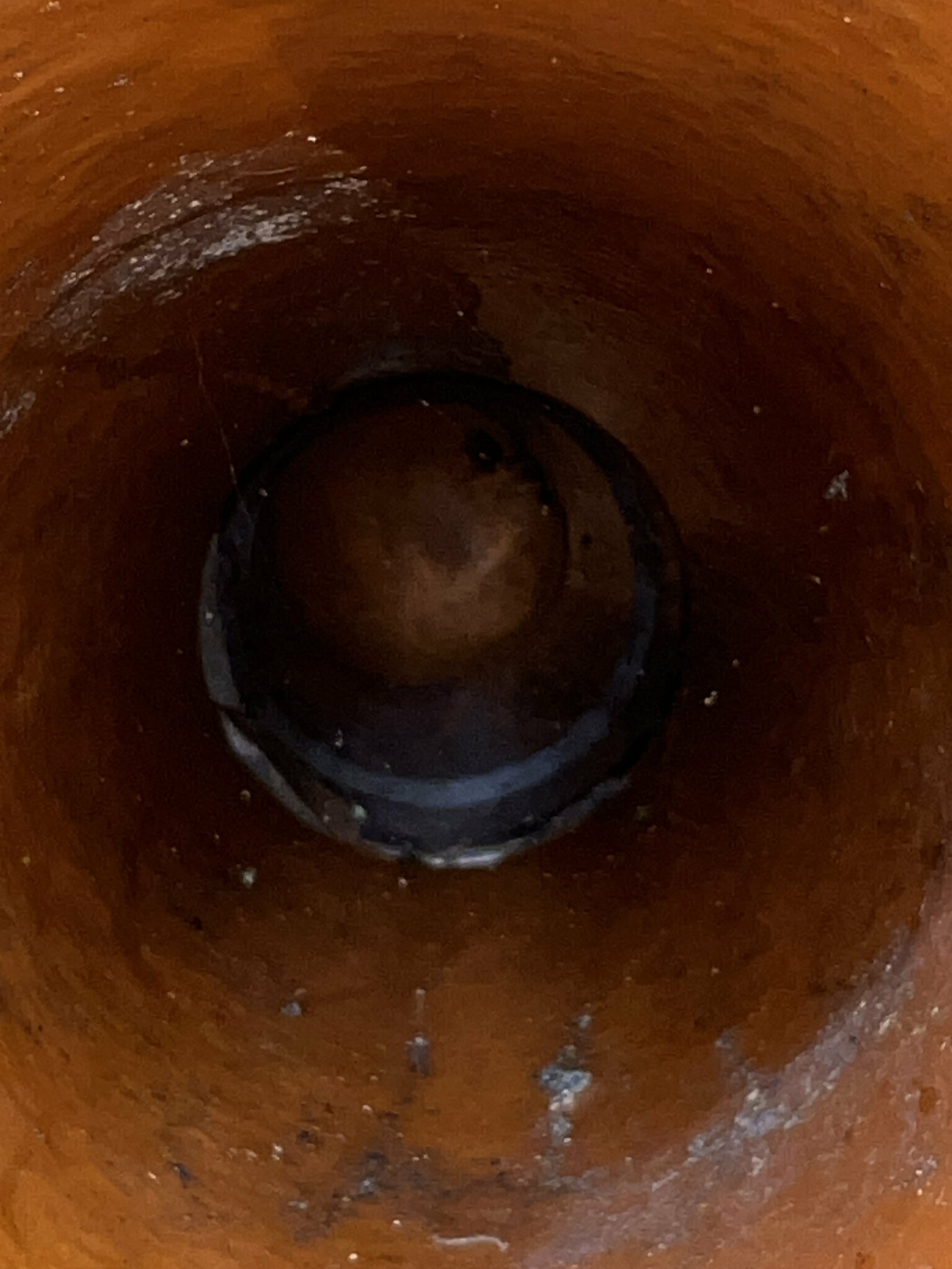 • Insidan av ett brunfärgat rör, med spår av slitage och smuts, troligtvis ett avloppsrör som kanske behöver sättas fast.