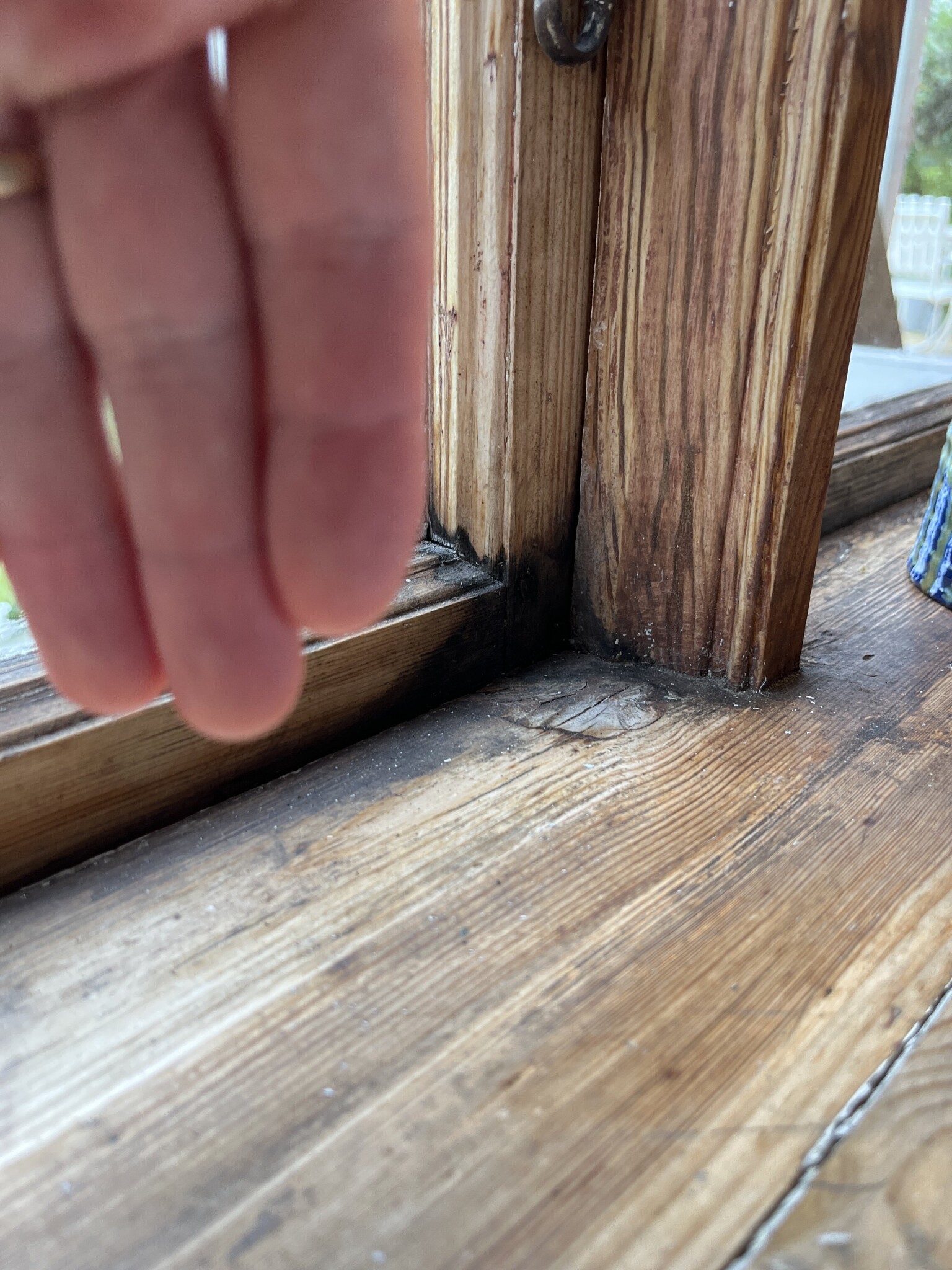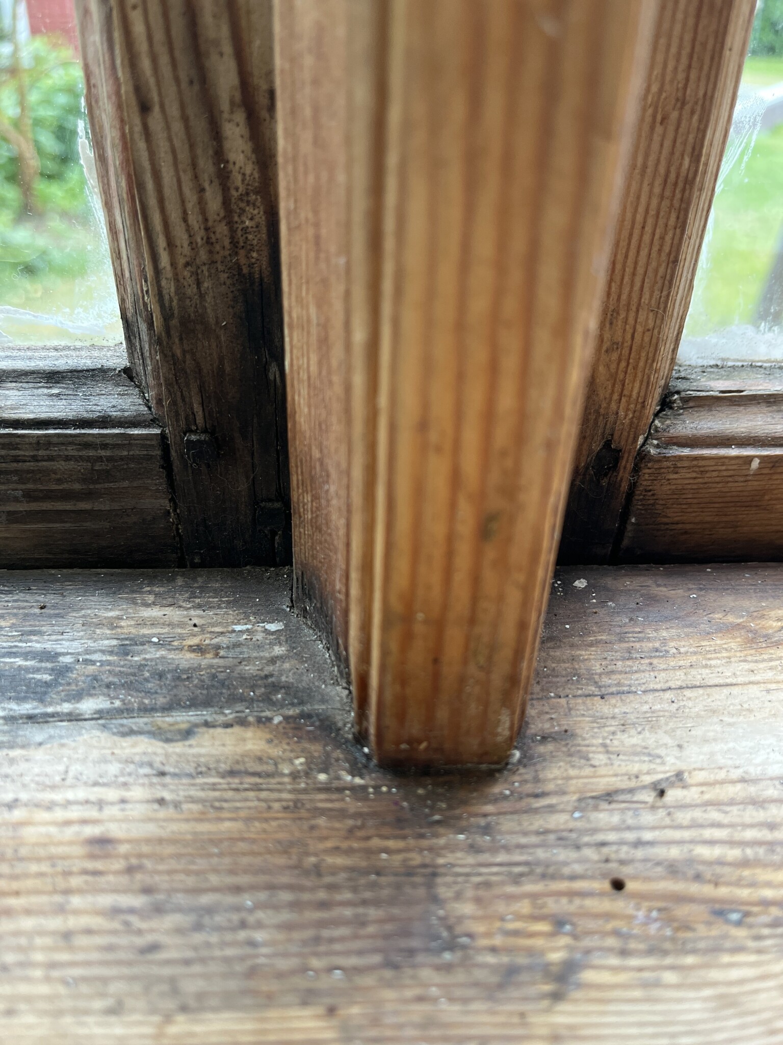 Hej. Har enkelglas. På yttersta fönstrets insida ses detta. Mögel? Virket är hårt och torrt. Slipa för att ta bort? Mögelmedel?
