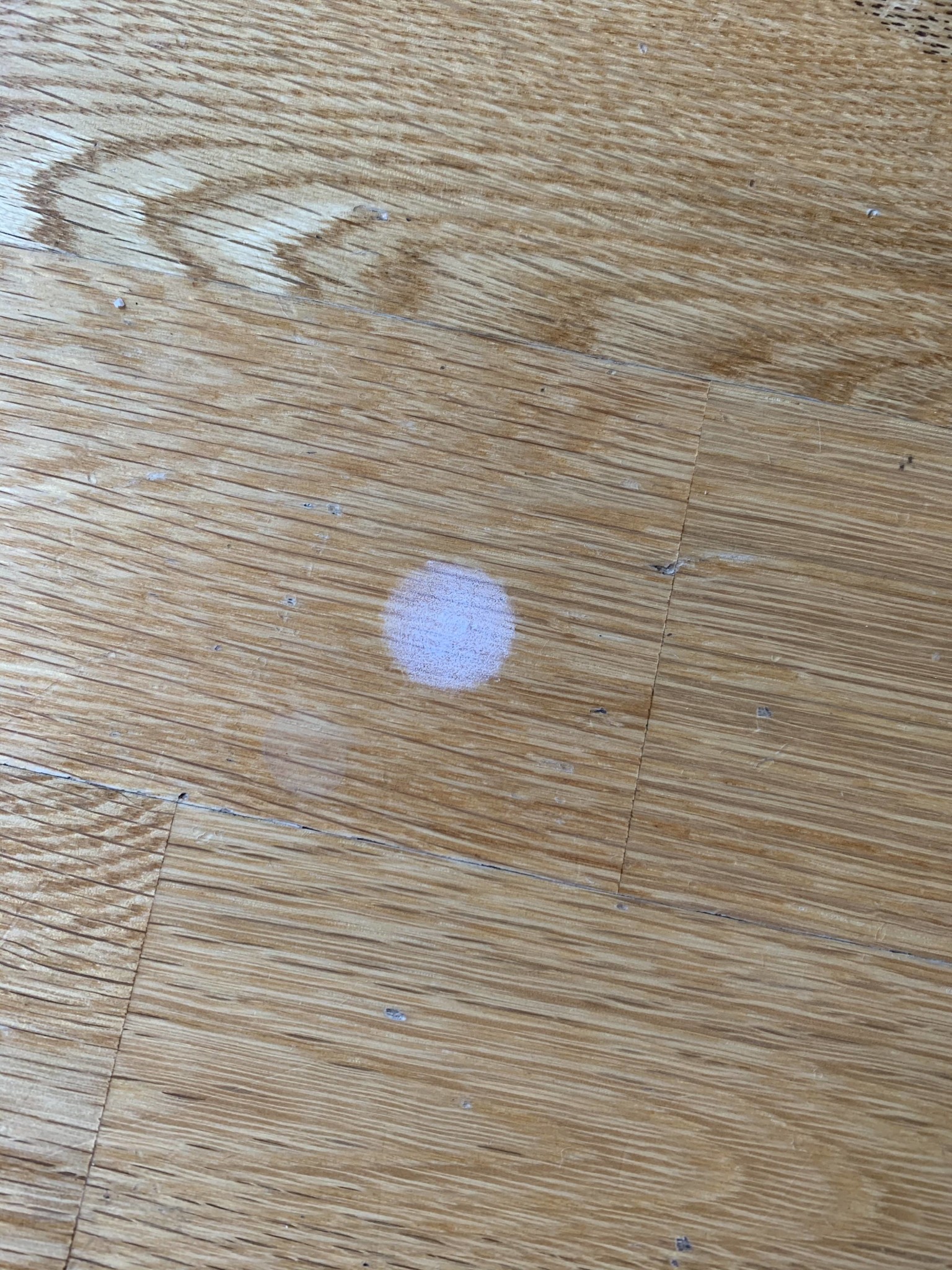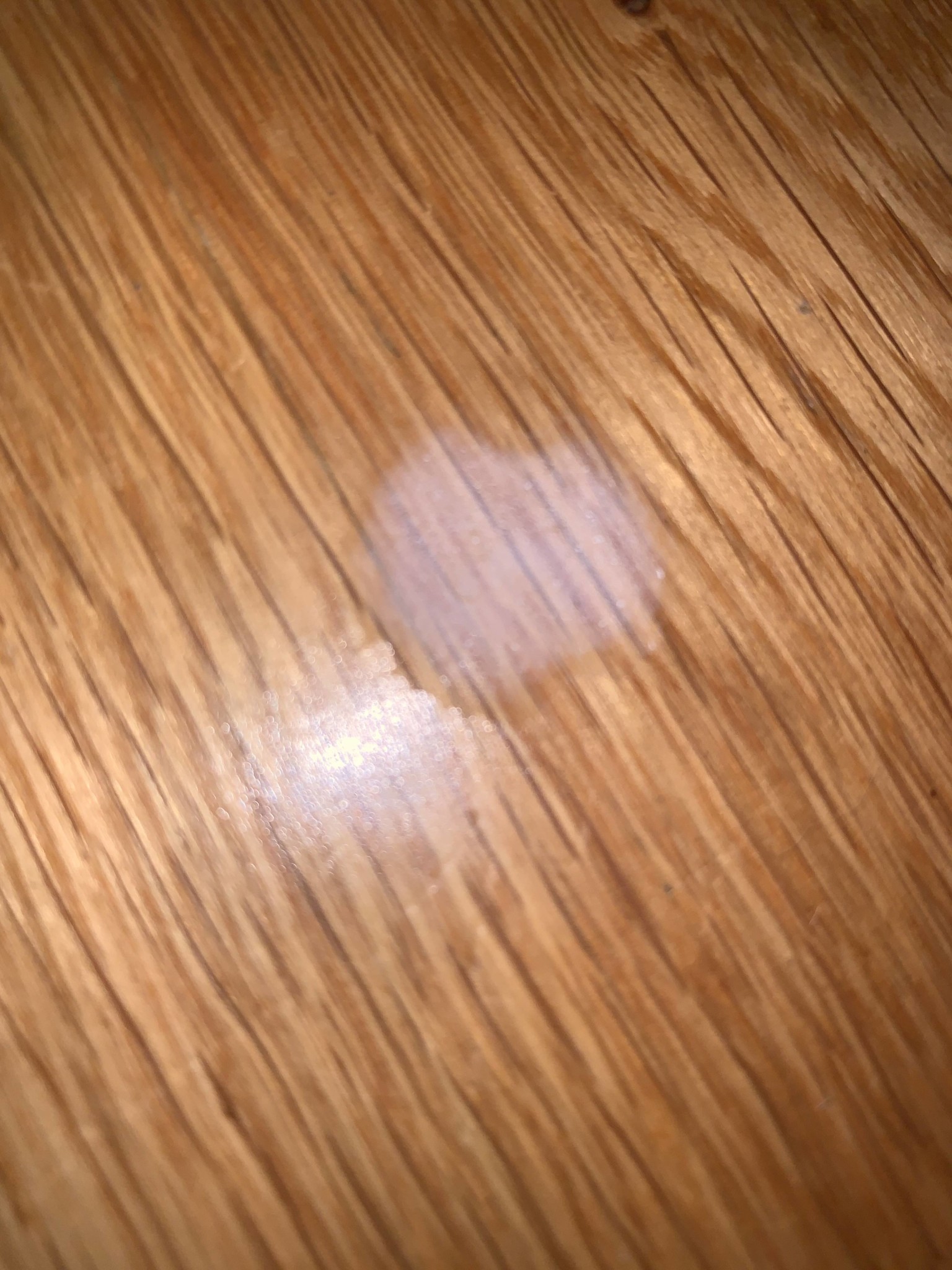 Små grå/vita fläckar som enkelt går bort med vatten. Luktar inget.