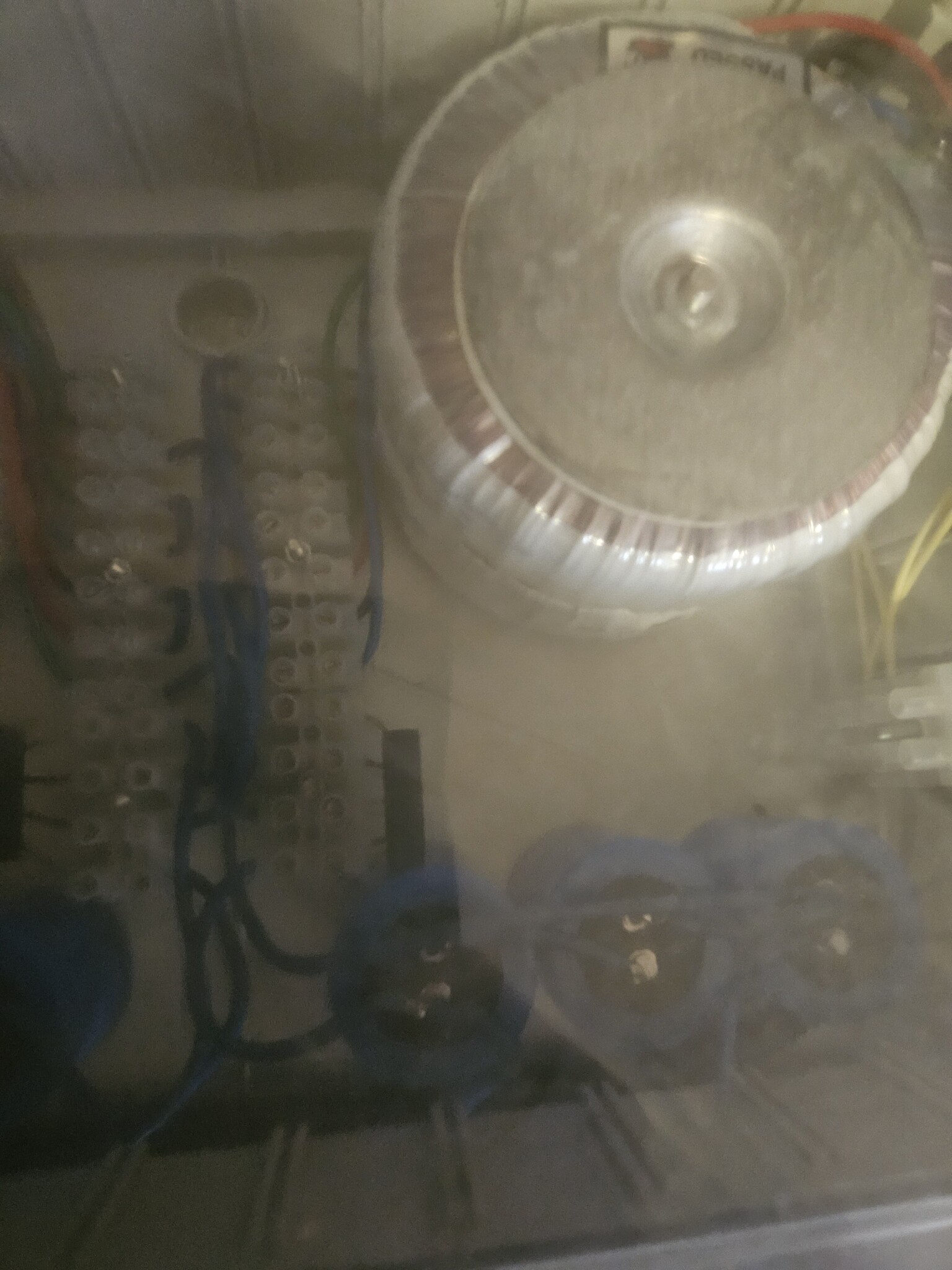 Men kopplingen syns, så transingarna blir matat med nätspänning på de ljusgula ledarna, och nedtransformerad spänning på de lite mer färglada.