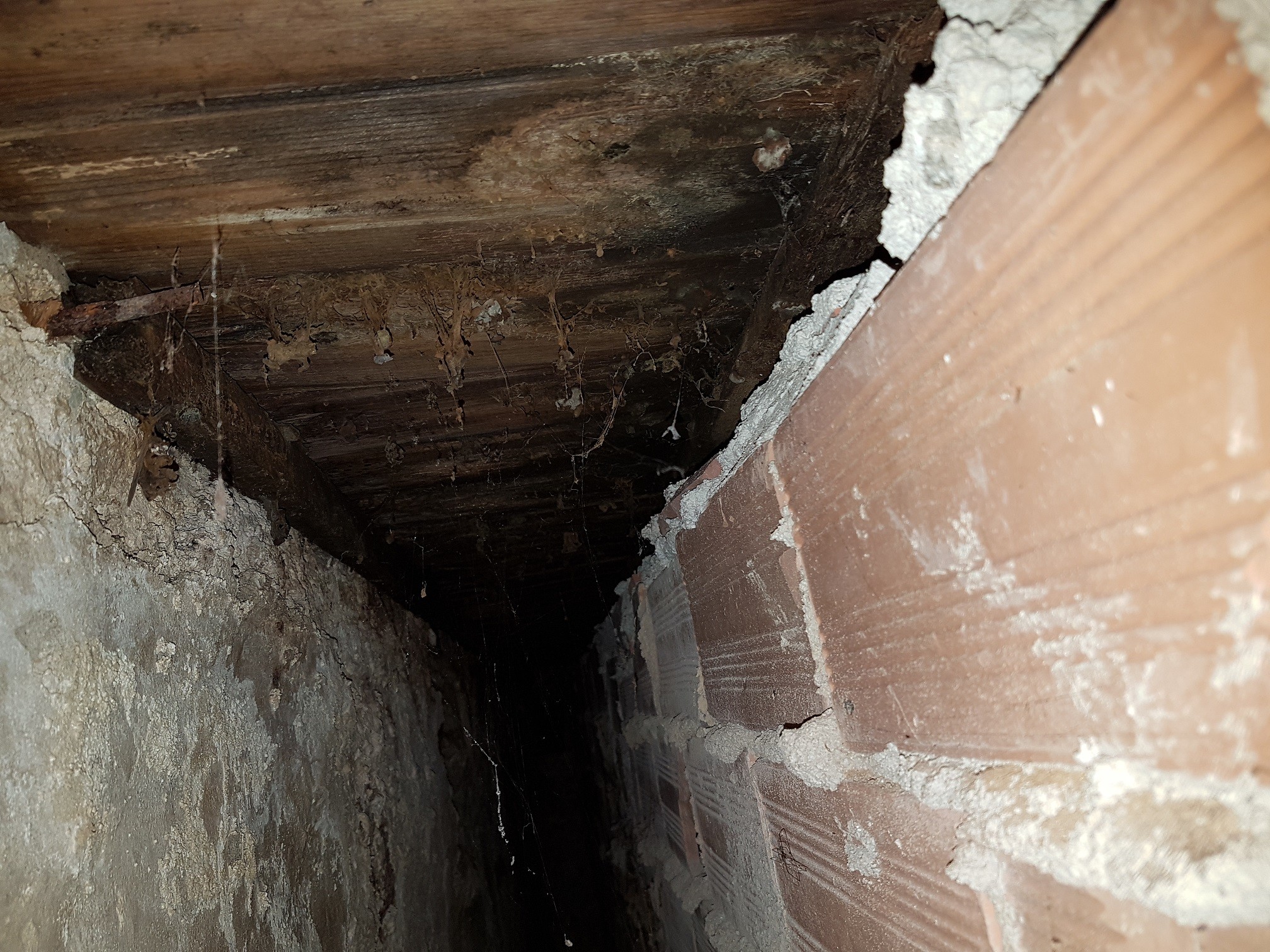 Vi har ett sommarhus i Kroatien. Ytterväggarna är sten, sedan har vi en luftspalt är därefter tegel. Tyvärr har de lämnat träplankor i luftspalten mellan stenväggen och tegelväggen som börjat angripas av någon form av mögel. Det är svårt för oss att komma åt och ta bort dessa plankor, men måste nog försöka öppna tegelväggen och plocka bort dem på ngt sätt. Om inte det funkar så hoppas jag kunna få bort fukten med ett nytt fläktsystem.