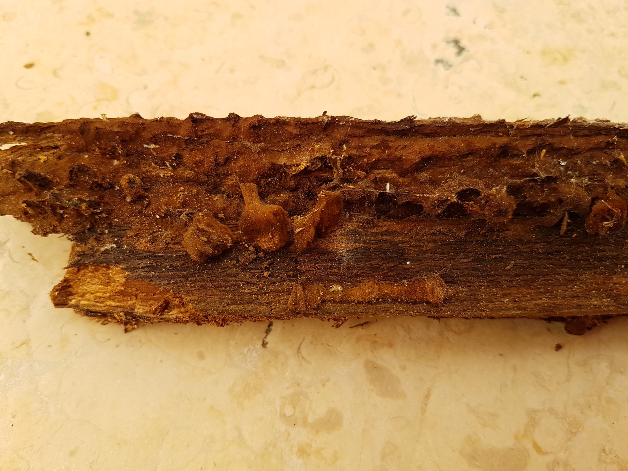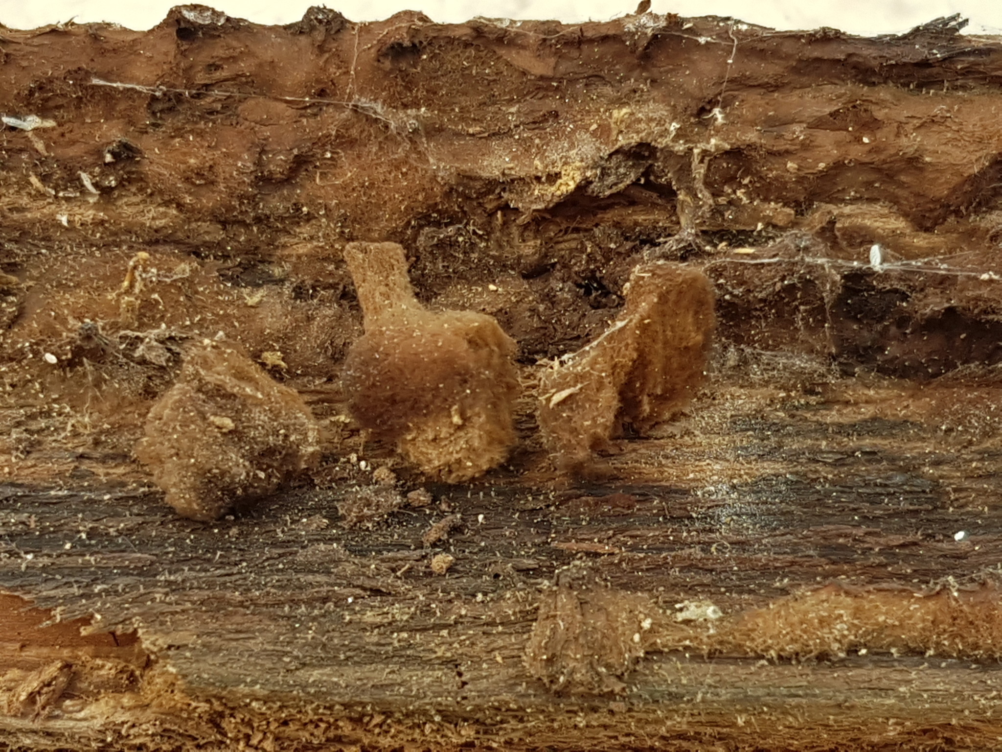 Sorry, såg först nu att ngn svarat på inlägget. Här ett par närbilder om det hjälper. De påminner litegrann om röksvamp i strukturen, dvs fot och hatt är i ett och samma stycke. De är relativt torra när man tar i dem. Träet är dock rejält murket (smular sönder).L Lärospånet skrev: