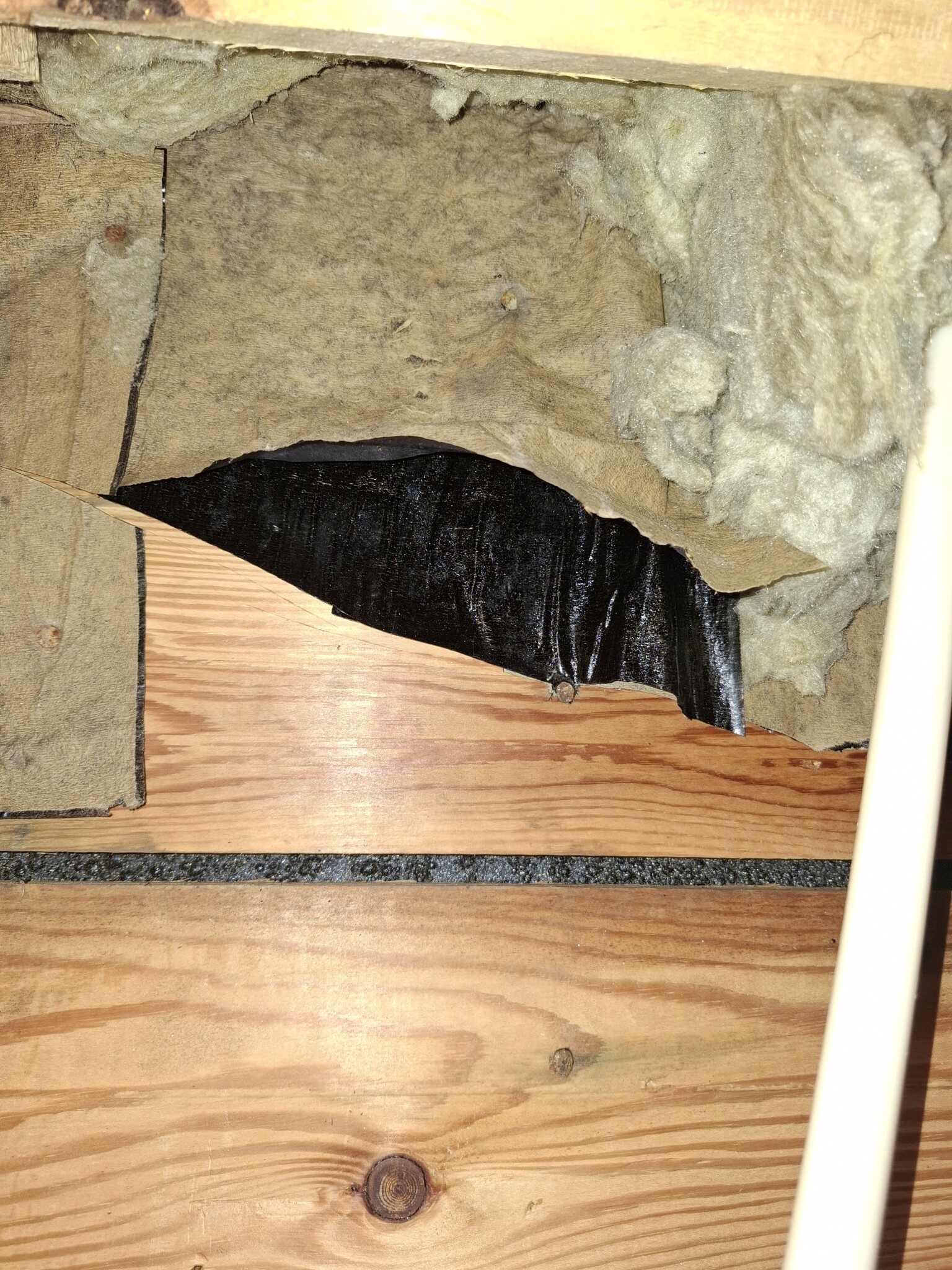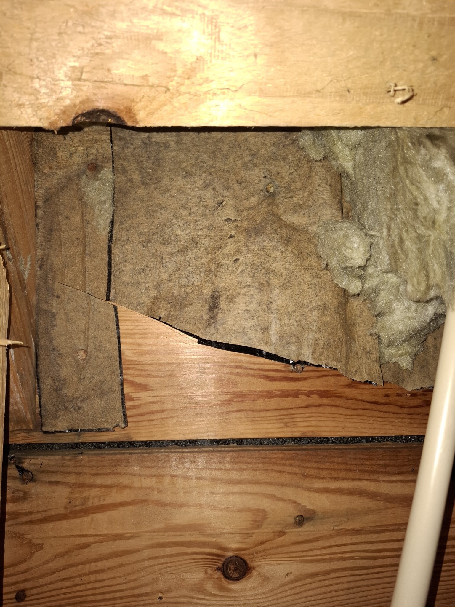 Den här pappen sitter på insidan av råsponten mot yttertaket. Är det någon som vet vad det är för typ av papp? Någon typ av asfaltpapp? Det har varit så i 50 år och råsponten ser frisk ut. Men är det en risk att stänga in råsponten mellan underlagspapp och, vad det nu än är för papp som sitter på insidan av den? Eller kan man anta att det torkar upp ordentligt under den varma delen av året?