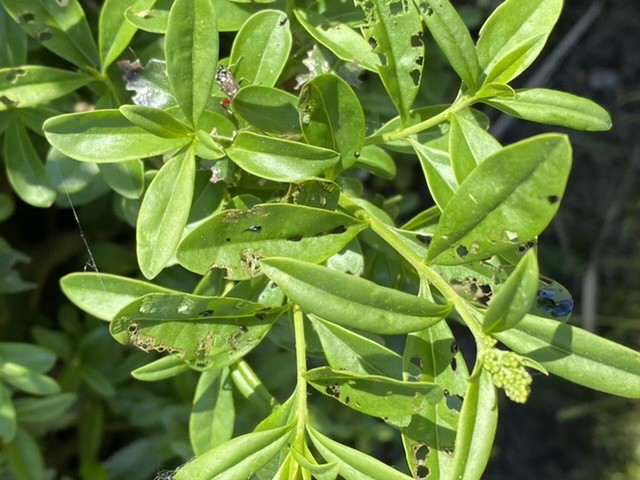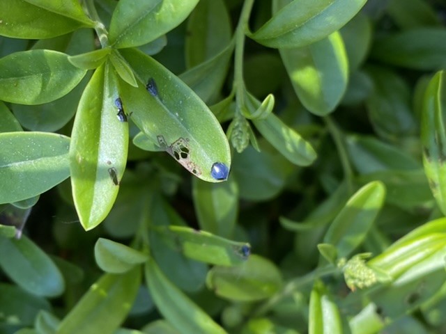 Någon tipsade om att det kan vara en larv som lever av rötterna och sedan fortsätter sitt liv som bladätande insekt. Undrar också över de svarta ”dropparna”. Är det rester av bären som växer rikligt på flertalet ställen i häcken eller något annat? Kan tillägga att häcken växer dålig på flera ställen och superbra på andra, trots likartade förhållanden. Flest bär på de klena buskarna.