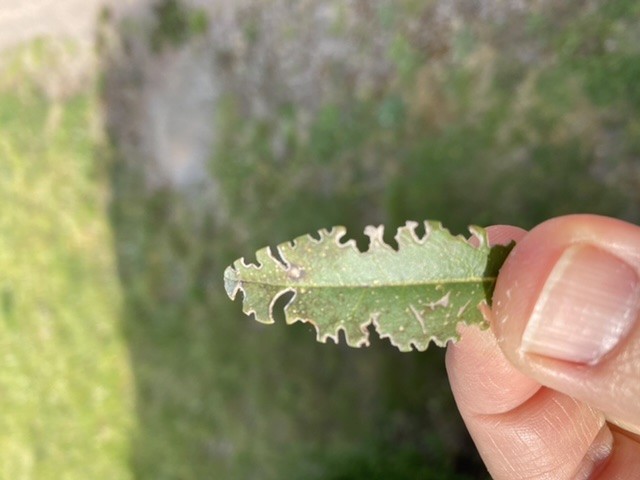 Larven du tänker på gissar jag är öronvivel, den är vanlig på Rhododendron men kan även angripa andra växter. Tycker inte det liknar öronvivelns tugg, brukar kallas för konduktörsklipp och sitter alltid i bladets yttre del. Här kan du läsa om öronviveln