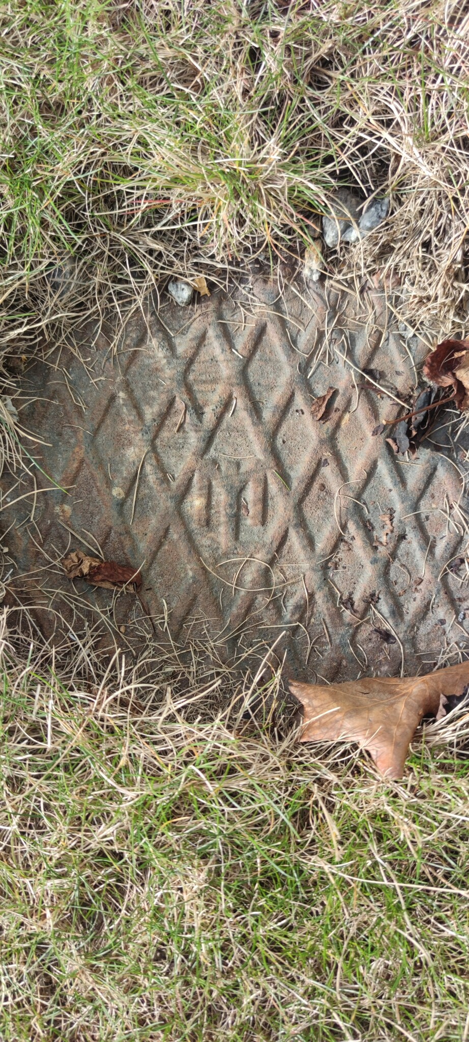 Någon form av brunnslock? Kan dölja " inkommande vatten", "inspektion av dränering", "renslucka för avlopp" och en del annat. Du får rensa runt kanterna och se efter om du kan öppna locket för att se vad, som döljer sig därunder.
