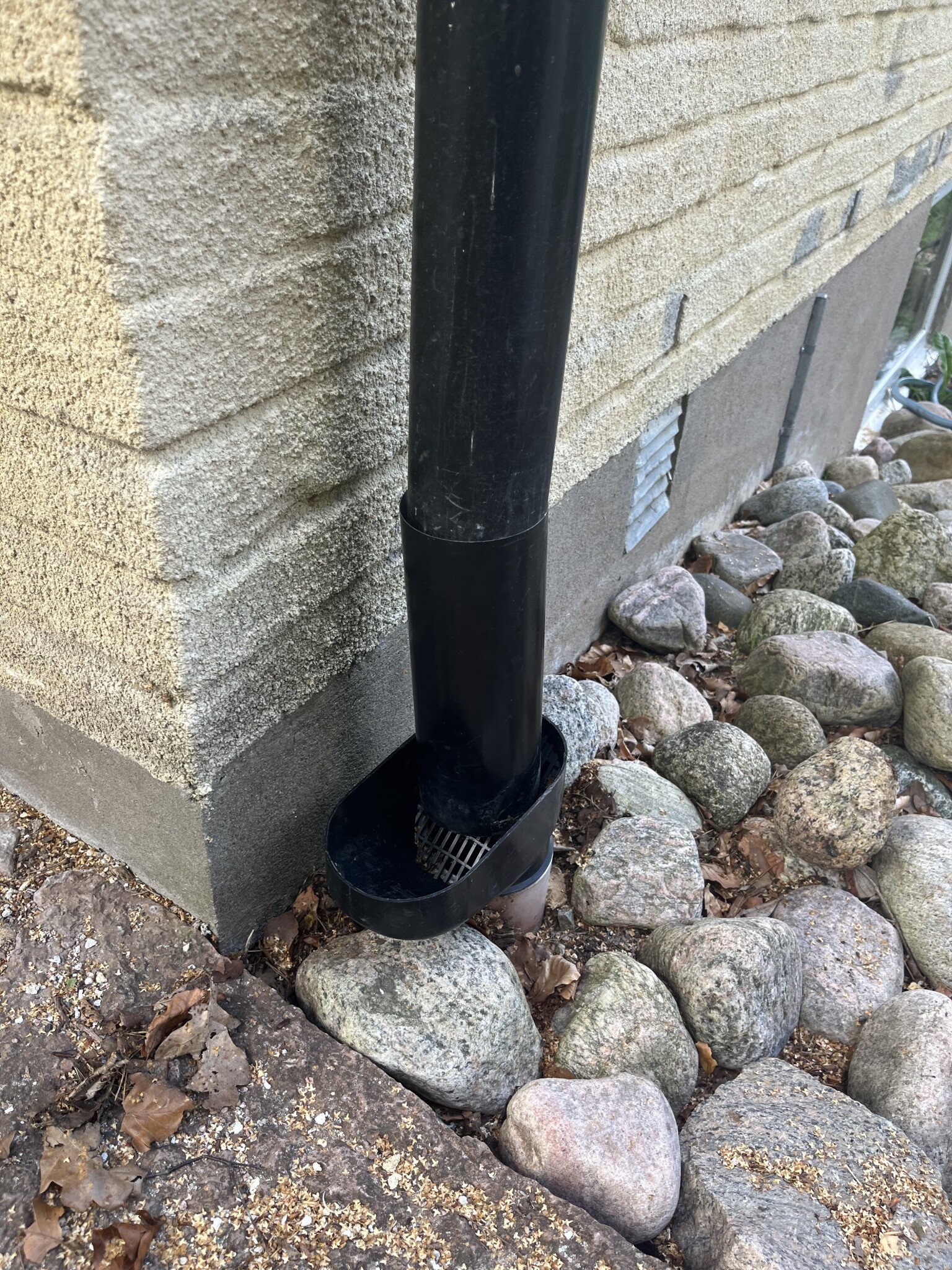 I hörnet, vid den vänstra väggen, så finns det ett stuprör. Jag kan inte finna någon skarv som har glidit isär. När jag filmade så såg det bra ut. Dagvattenledningen ligger på ca 2,5 m nedanför ventilen på väggen, som är marknivån. Därefter lutar marken brant åt vänster.