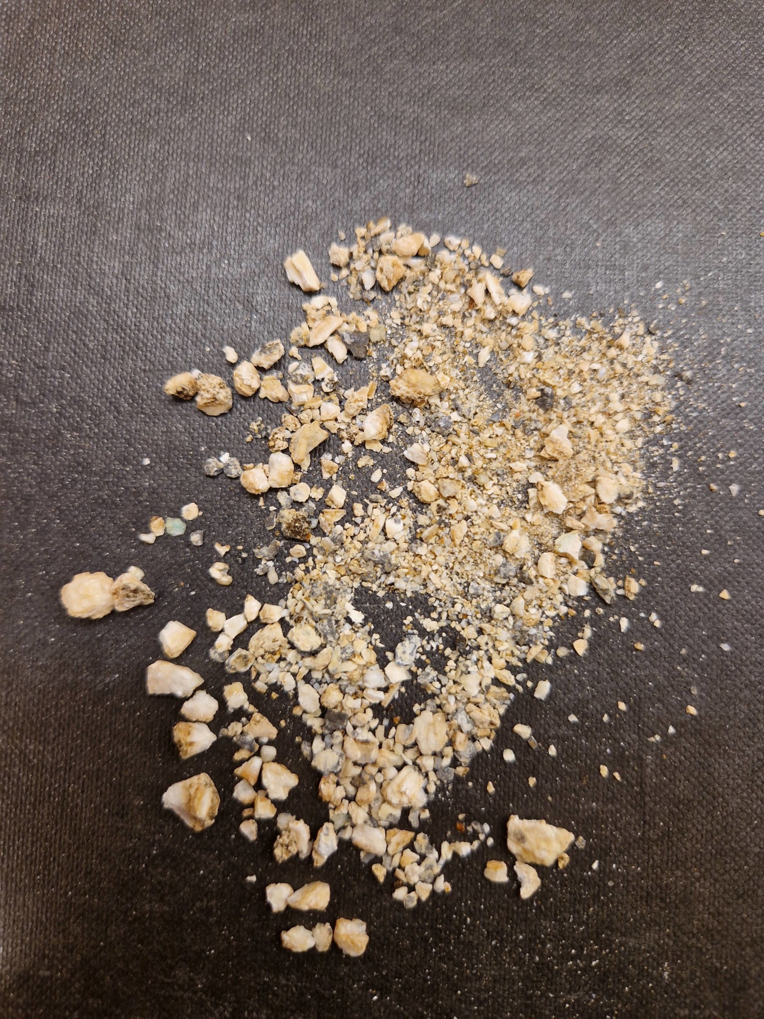 Det var ingen större reaktion, kom några få bubblor. När det hade legat över natten hade det löst upp sig lite mer och gick det lite lättare att mosa det mellan fingrarna.