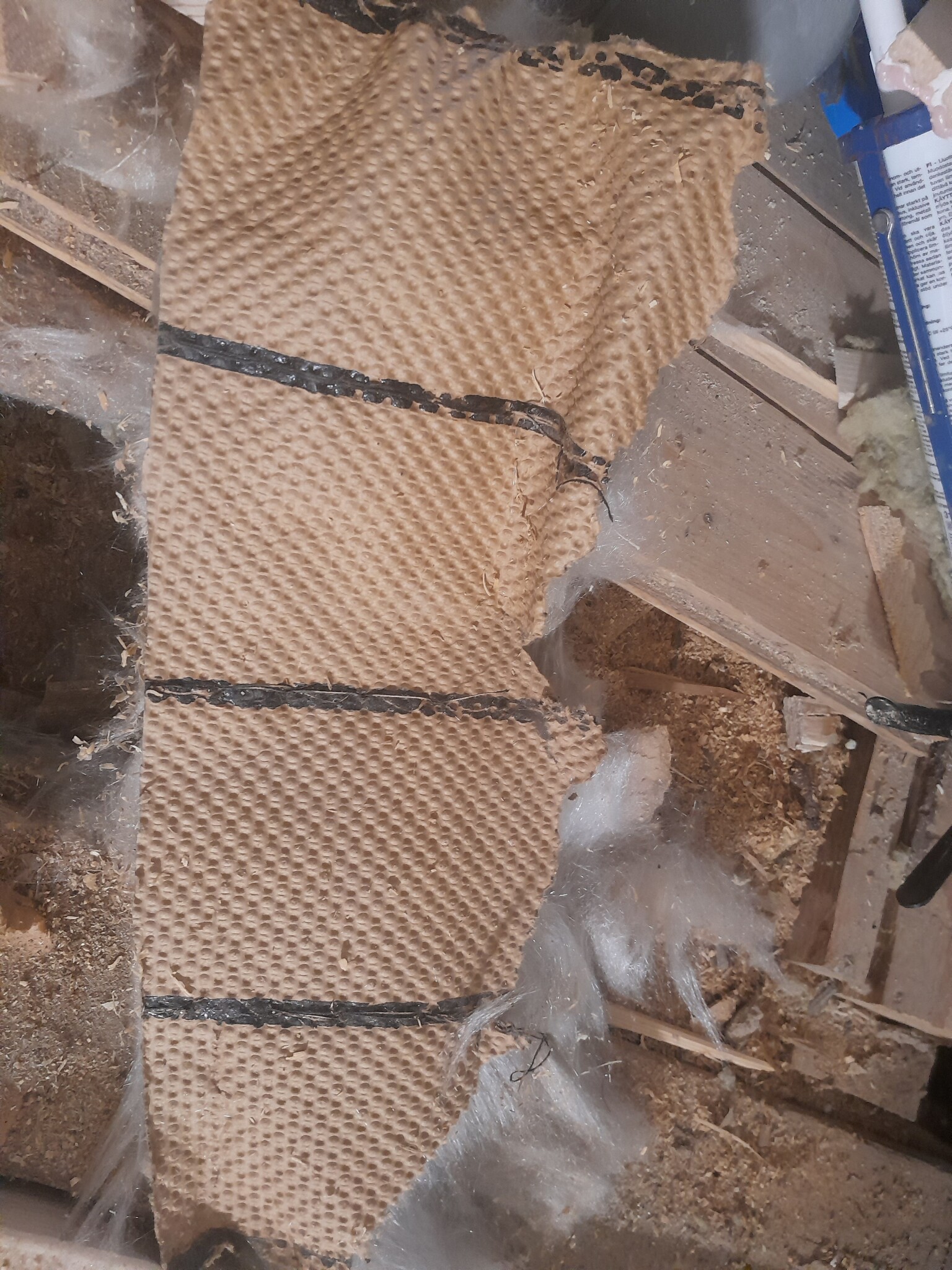 Håller på att riva ur bjälklaget på övervåningen. Bland spån och skräp ligger det sådant som bilden visar. Det är någon papp, varpå det sitter något glasfiberliknande.