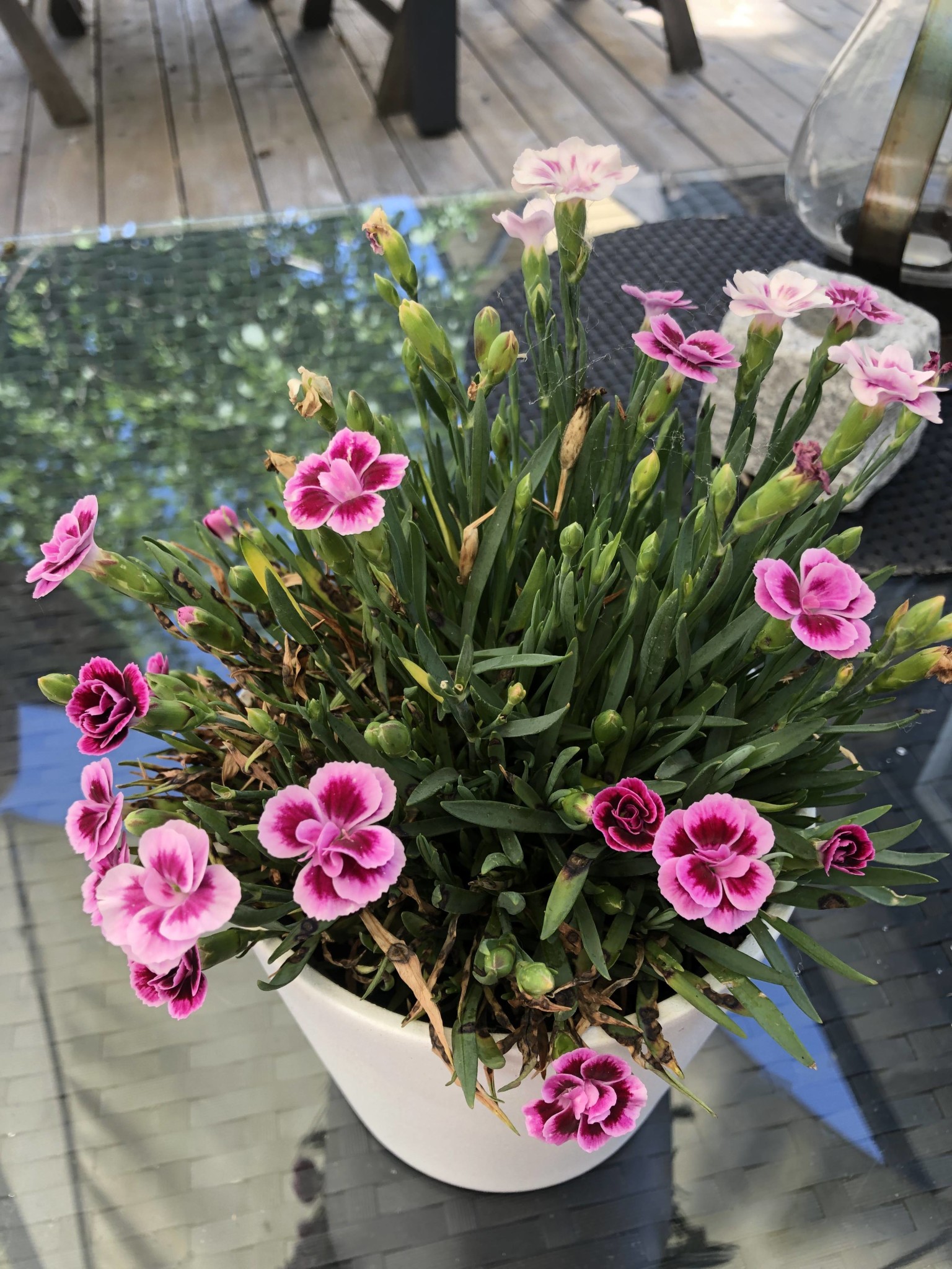 Det är en nejlika, någon av alla de namnsorter som odlas. Går utmärkt att sätta den i kruka.