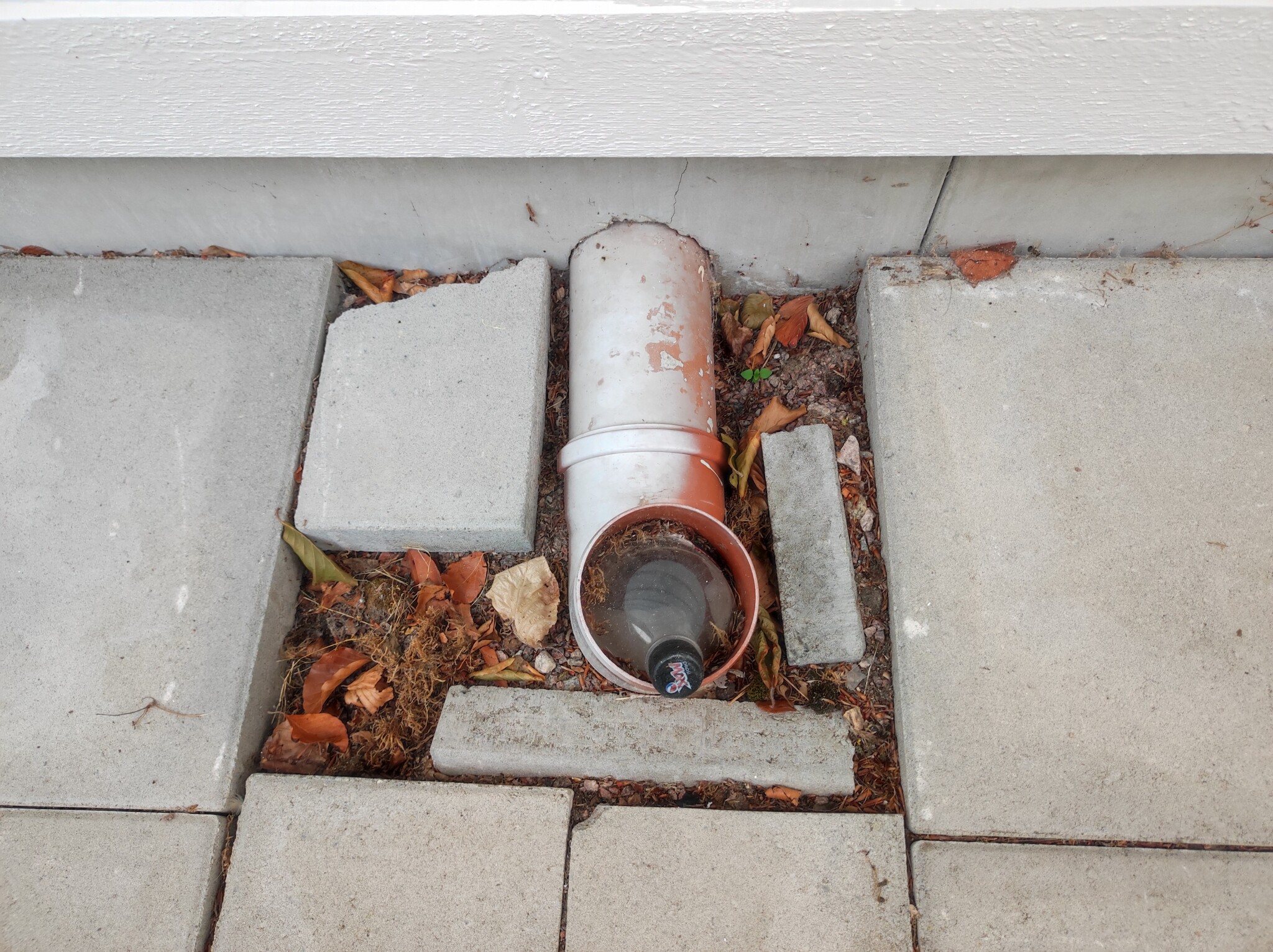 Det sitter en flaska i där och kanske för att djur inte ska gå in. Ta bort flaskan, lyssna i röret, spola i en toa, samt i köket och hör om det skvalar. Kan även vara någon form av ventilation i grunden, som täppts till mot djurbesök.