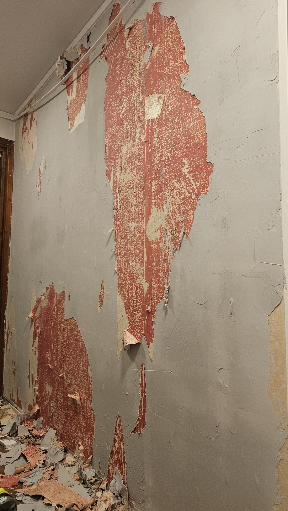 Jag vill tillägga att jag förstår att när man river ner en tapet det ser lite luddig för det är själva papprets egenskaper att det kan ser ut så där, men med tanke på husets bygg år, är man lite för oroligt att man stöter nåt farligt dammigt material.