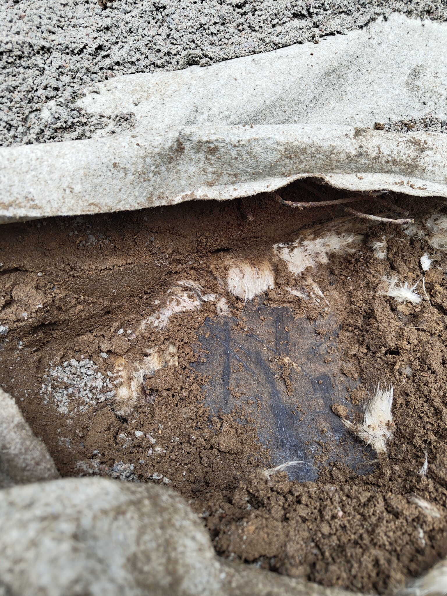 Jag stöter först på stenplattor ovanpå grus, ovanpå en markduk. Under den finns ett jordlager och sen vad jag tror är toppen på jordkällaren, här någon form av järnbalk som ligger ovanför.