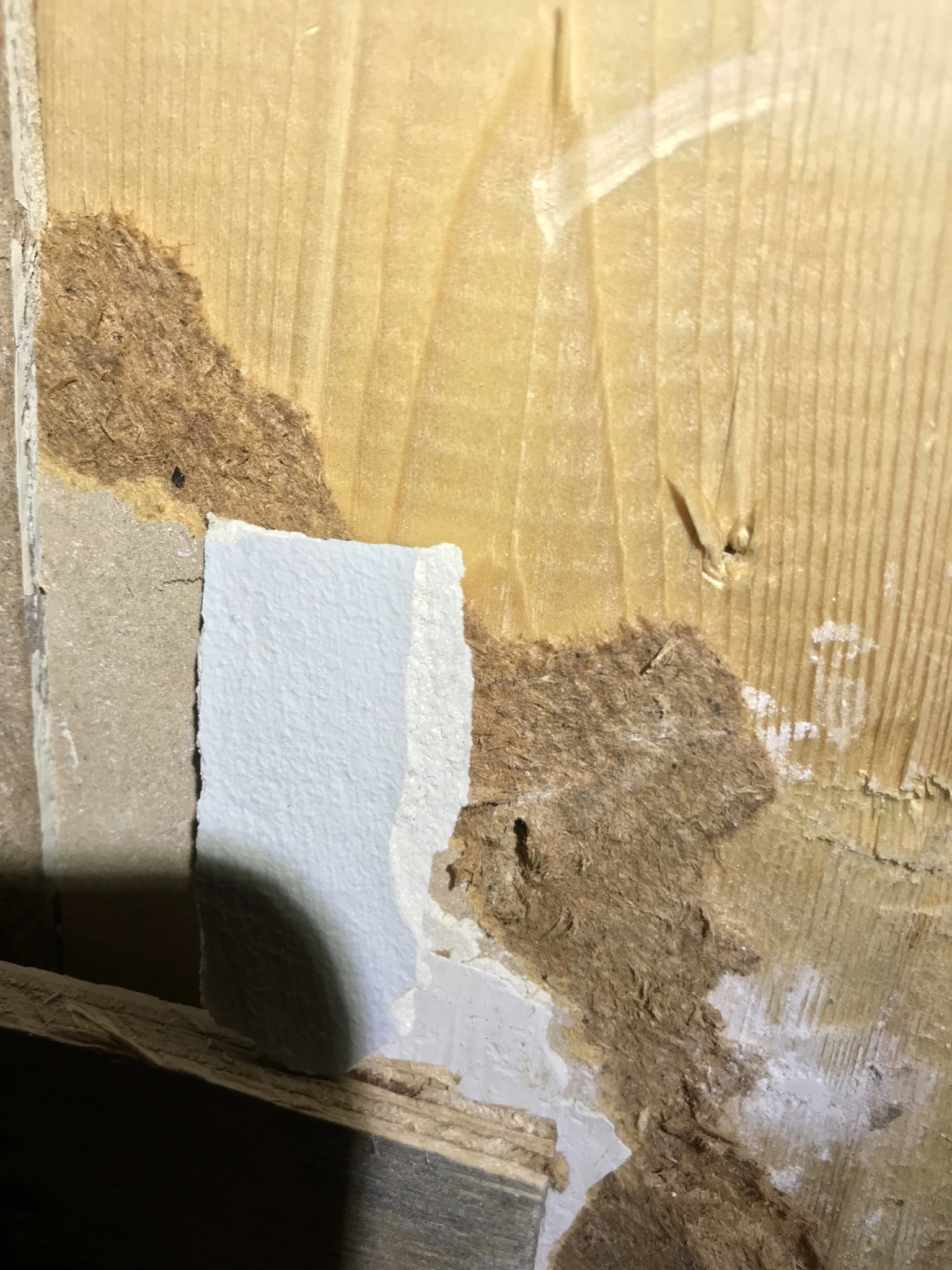 Bakom ett av köksskåpen hittade jag en tunn (1-2 mm) gipsliknande skiva, i det som ser ut att vara gips är det som ett skimrande/glittrande skikt, vad kan det vara för material?