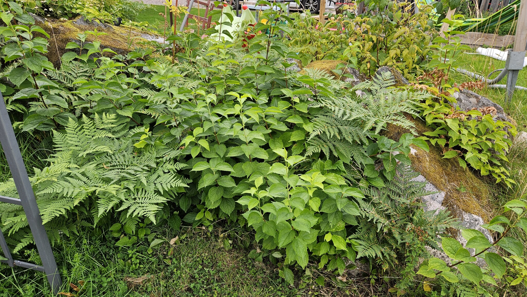 Gröna växter och ormbunkar växer i en trädgård intill en sten med mossa och högt gräs.