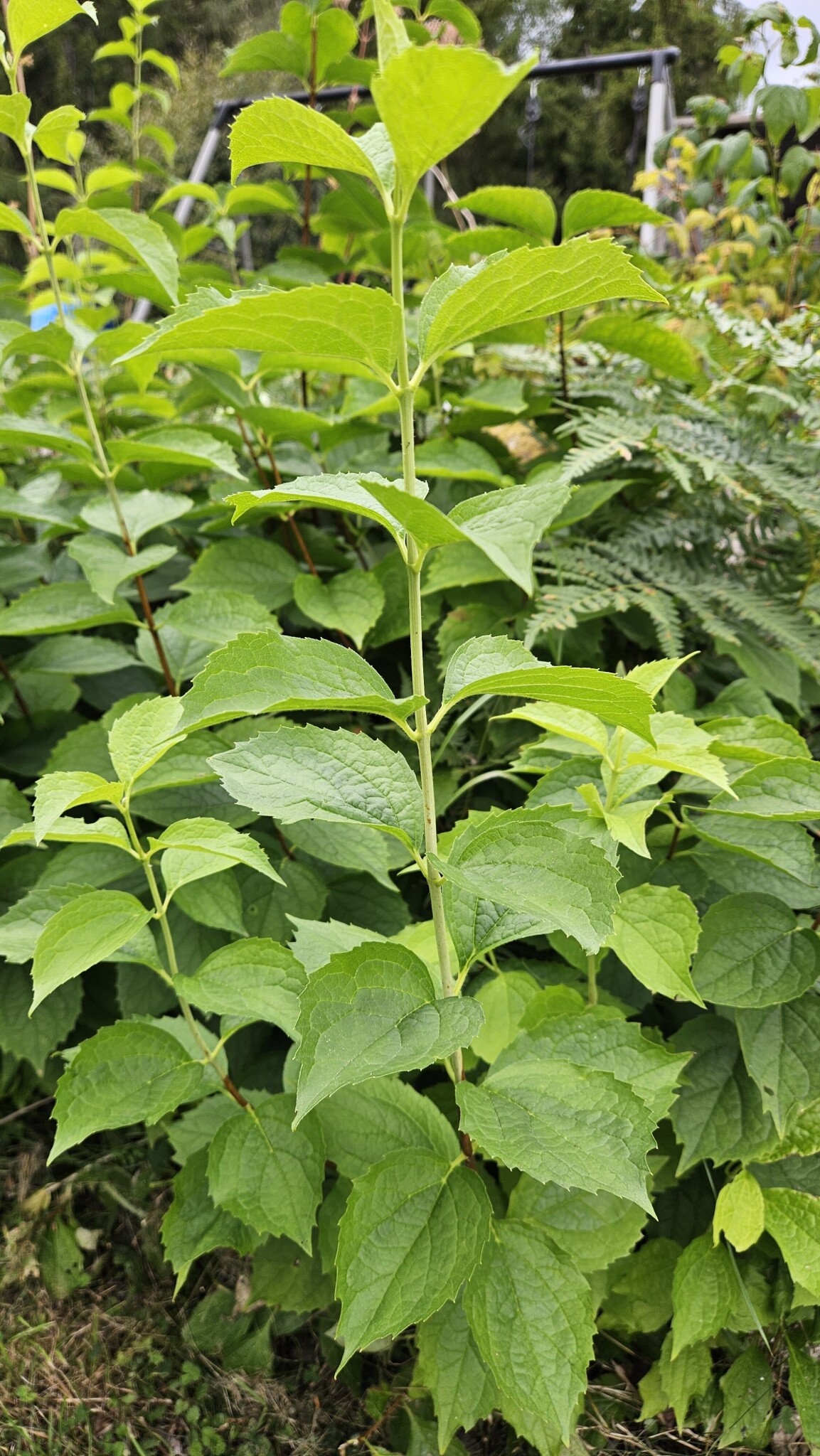 Grön växt med sågade blad och lång stjälk, omgiven av fler liknande växter i en trädgårdsmiljö.