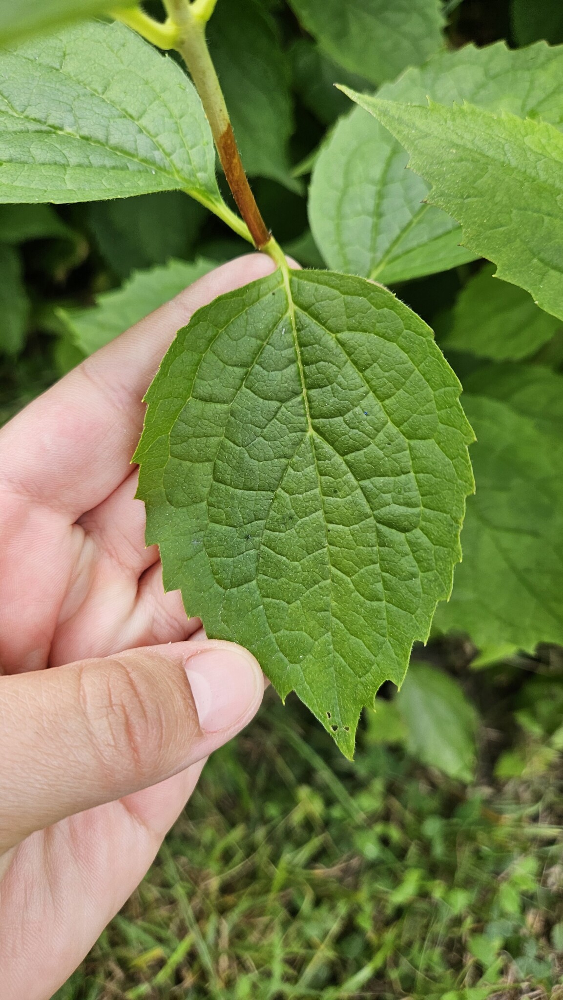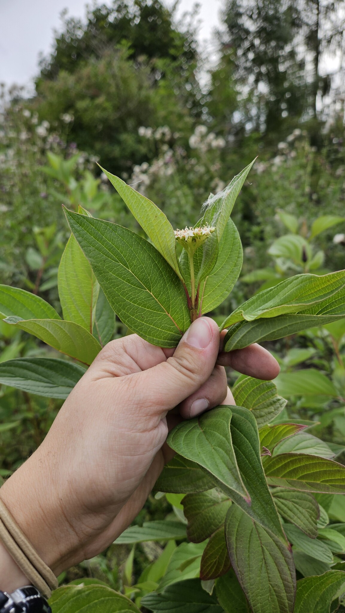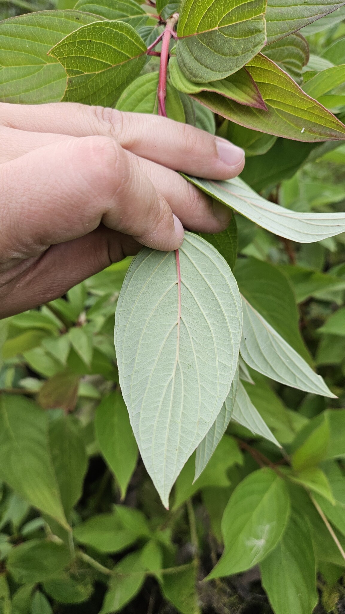 Hand håller ett blad med ljusgrön undersida och röd stjälk, omgiven av gröna blad.