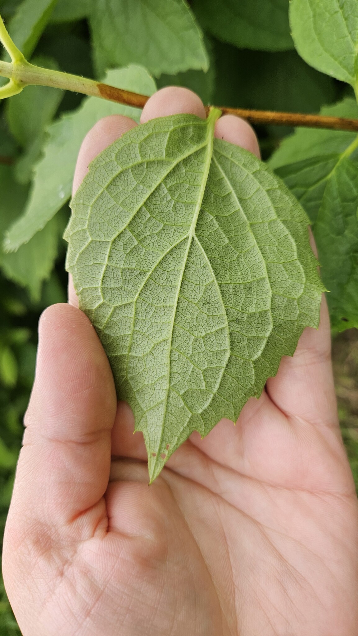 Närbild på en hand som håller ett grönt blad med tandade kanter och tydliga ådror.