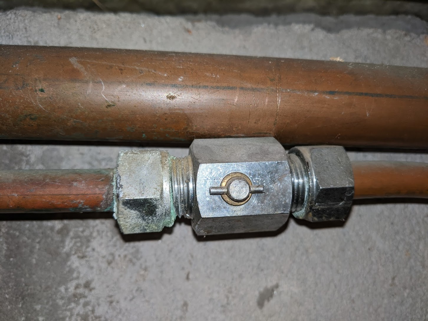 Tack för era svar. Vattenröret är grenat alldeles efter mätaren istället för kopplas på i rummet bredvid som resten av allt vatten i huset är. En gissning är att det va smidigt att få vatten under byggtiden vilket skulle betyda att den är sedan -76 och nej den har nog aldrig motionerats. Kommer inte ge mig på att byta den utan de får bli en skarv med ny Ballofix före jag pluggar röret vid gamla utkastaren istället.