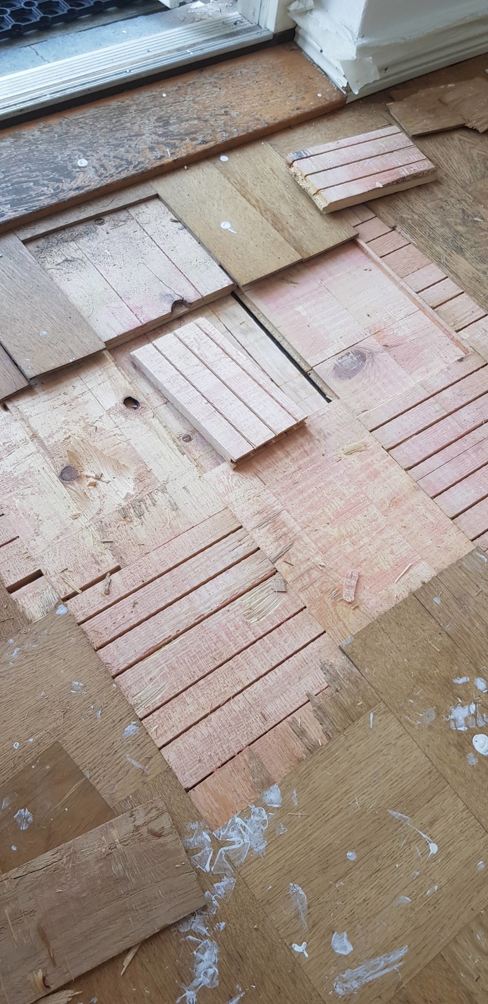 Golvet sviktar precis vid altandörren, vi river upp för att se vad som finns under, se bild.aldrig sett något liknande, trodde det skulle vara spånskivor eller träbrädor. Tanken är att lägga ekparkett. Vad gör jag- byter ut allt underrede eller bara förstärker där det sviktar?