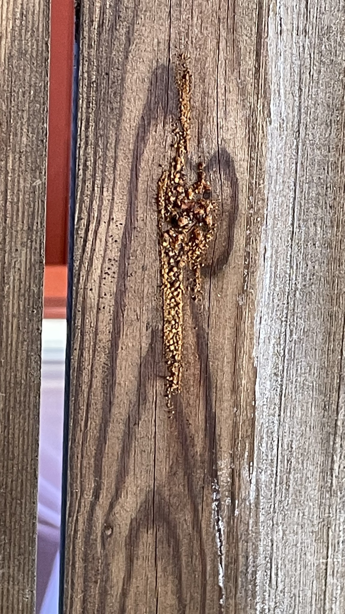 • En träplanka med harts eller saft som sipprar ur och kristalliseras. Naturligt och texturerat utseende.