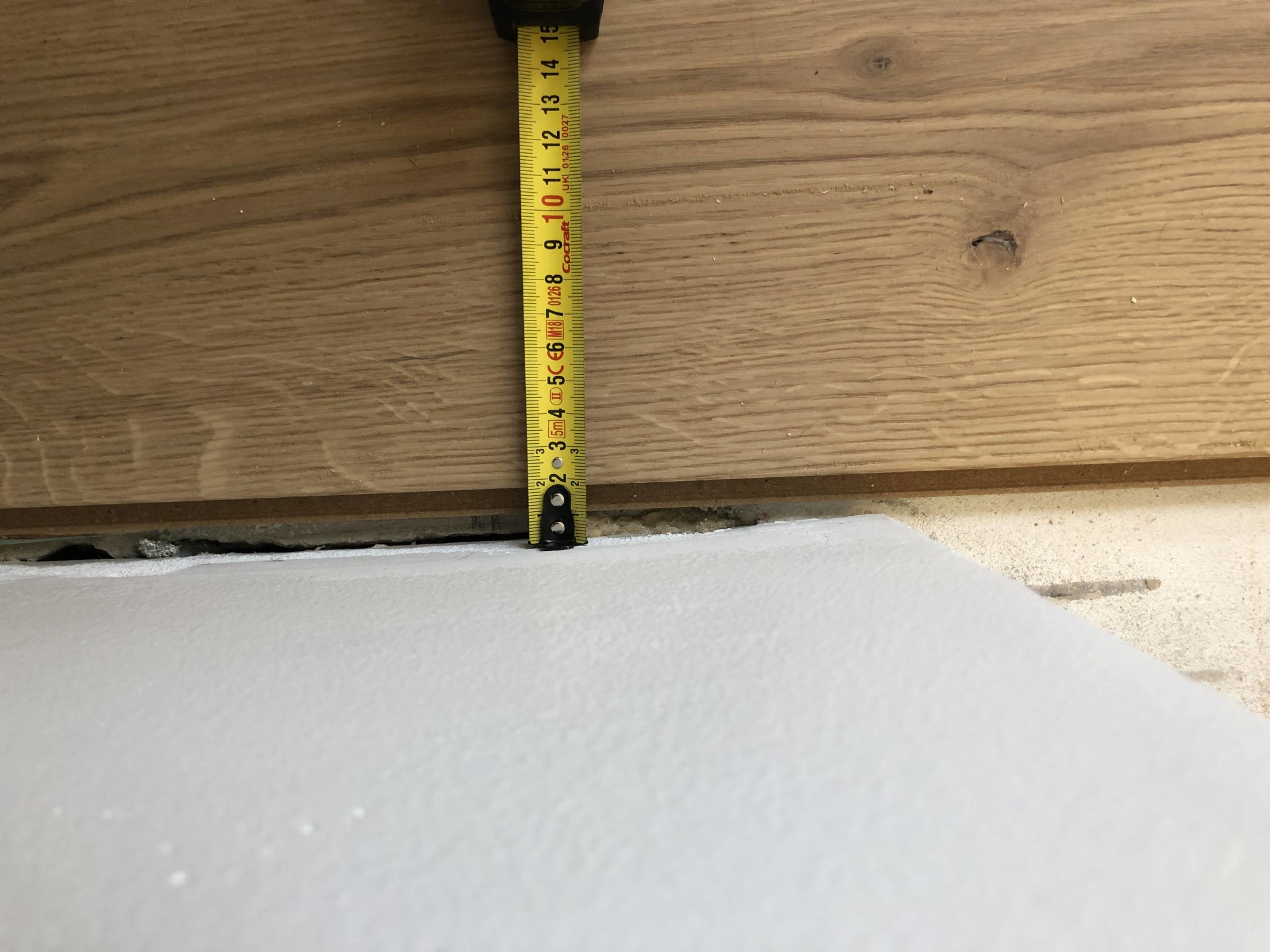 Hade vi fortsatt med vår läggning hade brädan gått 1-2 cm över, dvs vi hade fått 1,5 cm avstånd på ena sidan och andra haft bräda någon centimer ”över”. Inte bra, men det hade iaf blivit bättre.