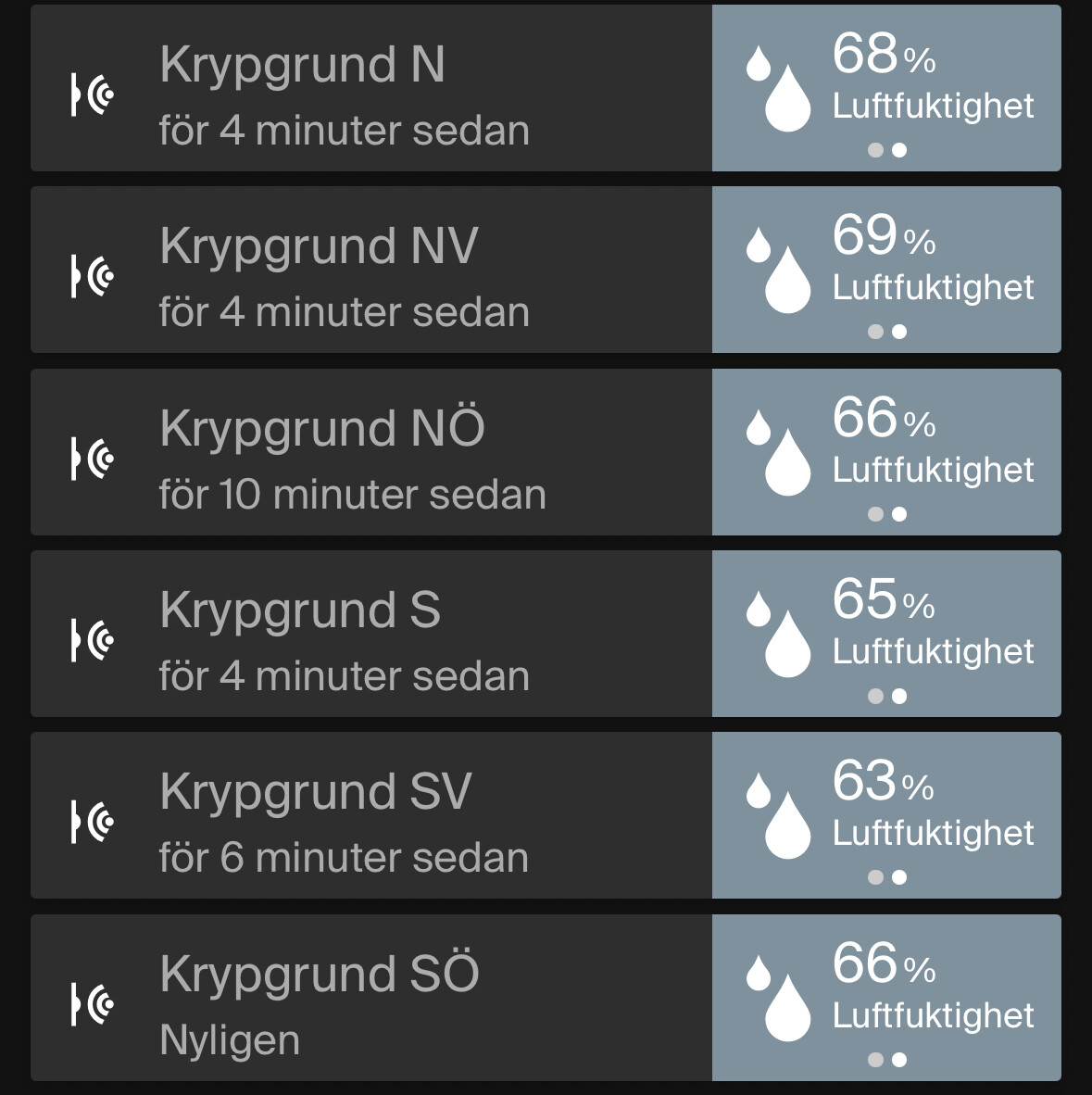 Som enkla och billiga åtgärder i första hand rekommenderar jag att du skaffar en fuktmätare av instickstyp som du kan mäta fuktkvoten i träet med, samt några mätare som mäter den relativa luftfuktigheten på ett par ställen i krypgrunden. Gärna digitala som sparar mätvärdena kontinuerligt så kan man följa trenderna.