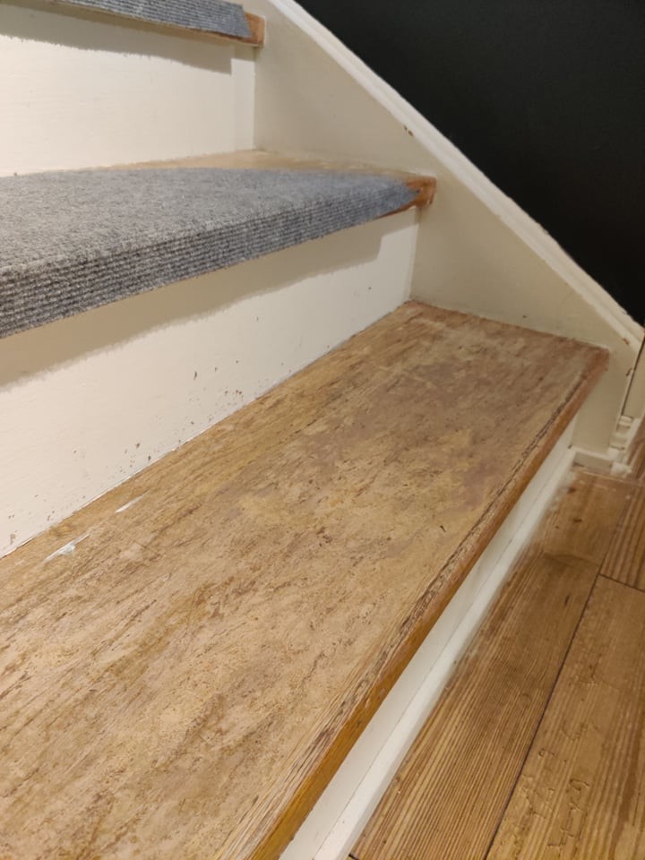Som sen har något ovanpå sig från början, matta, PVC-plattor etc. för det ser ut som halvdant bortslipat lim på trappsteget mitt i bilden. Sen en trappnos i hårdare träslag, kanske ek.