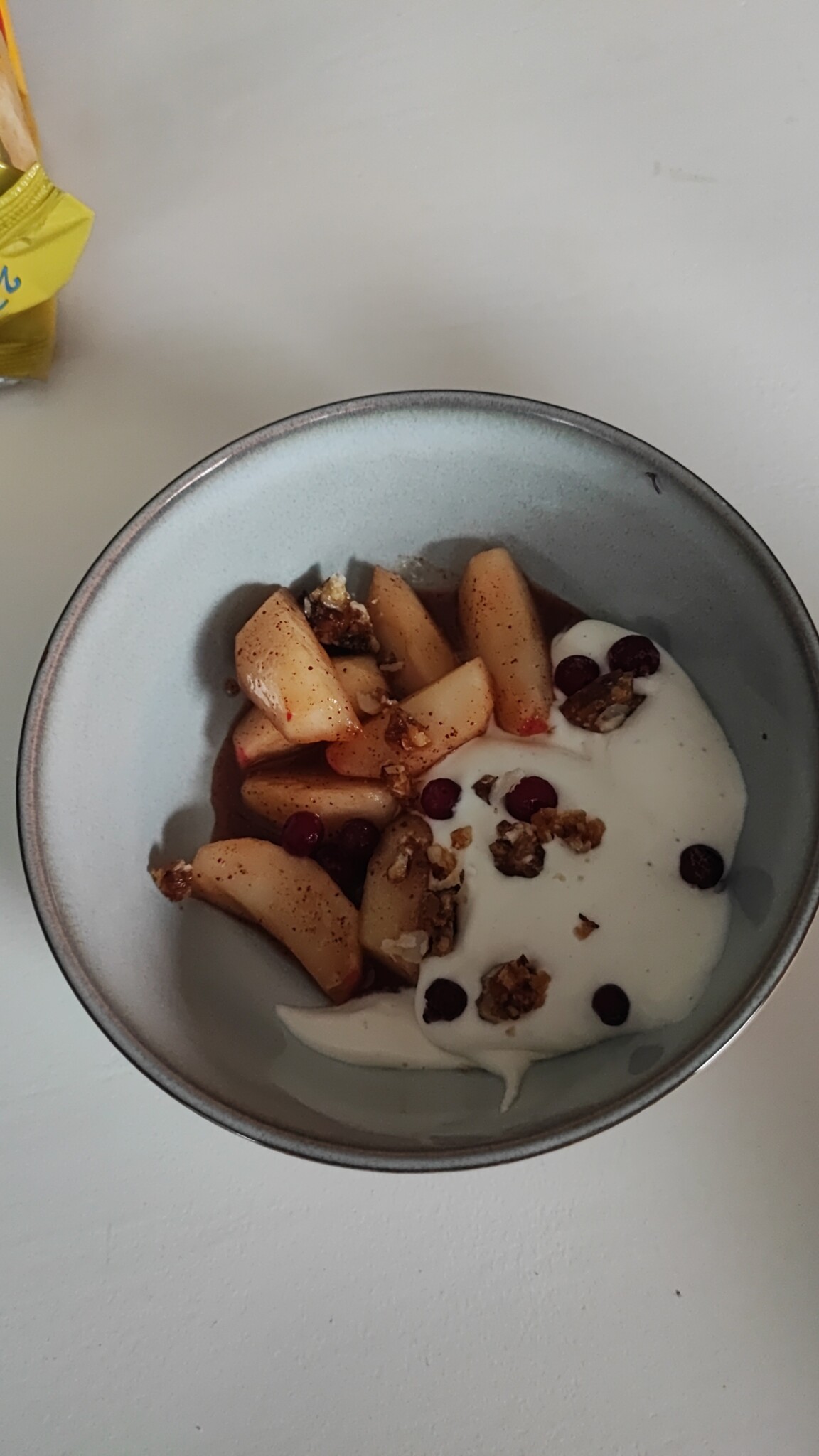 Äpplen, vaniljkräm, hasselnötsknäcke och lingon