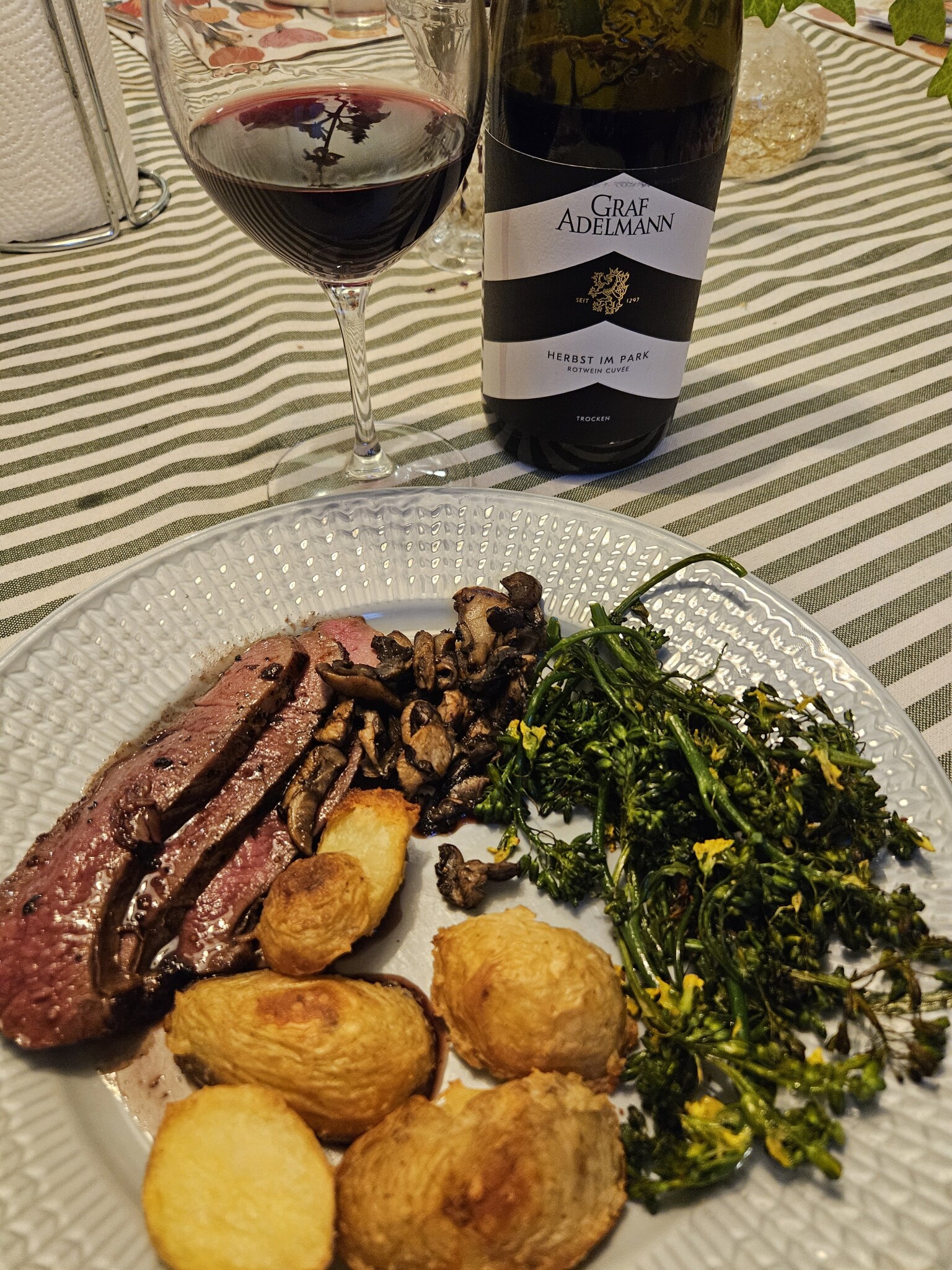 Hjortytterlår med rostad potatis och broccoliskott samt vitlökstekt kungschampinjon och rödvinssås. Mycket gott 'Herbst im Park' från Graf Adelman därtill https://oribuswein.de/produkt/2023_01-graf-adelmann/