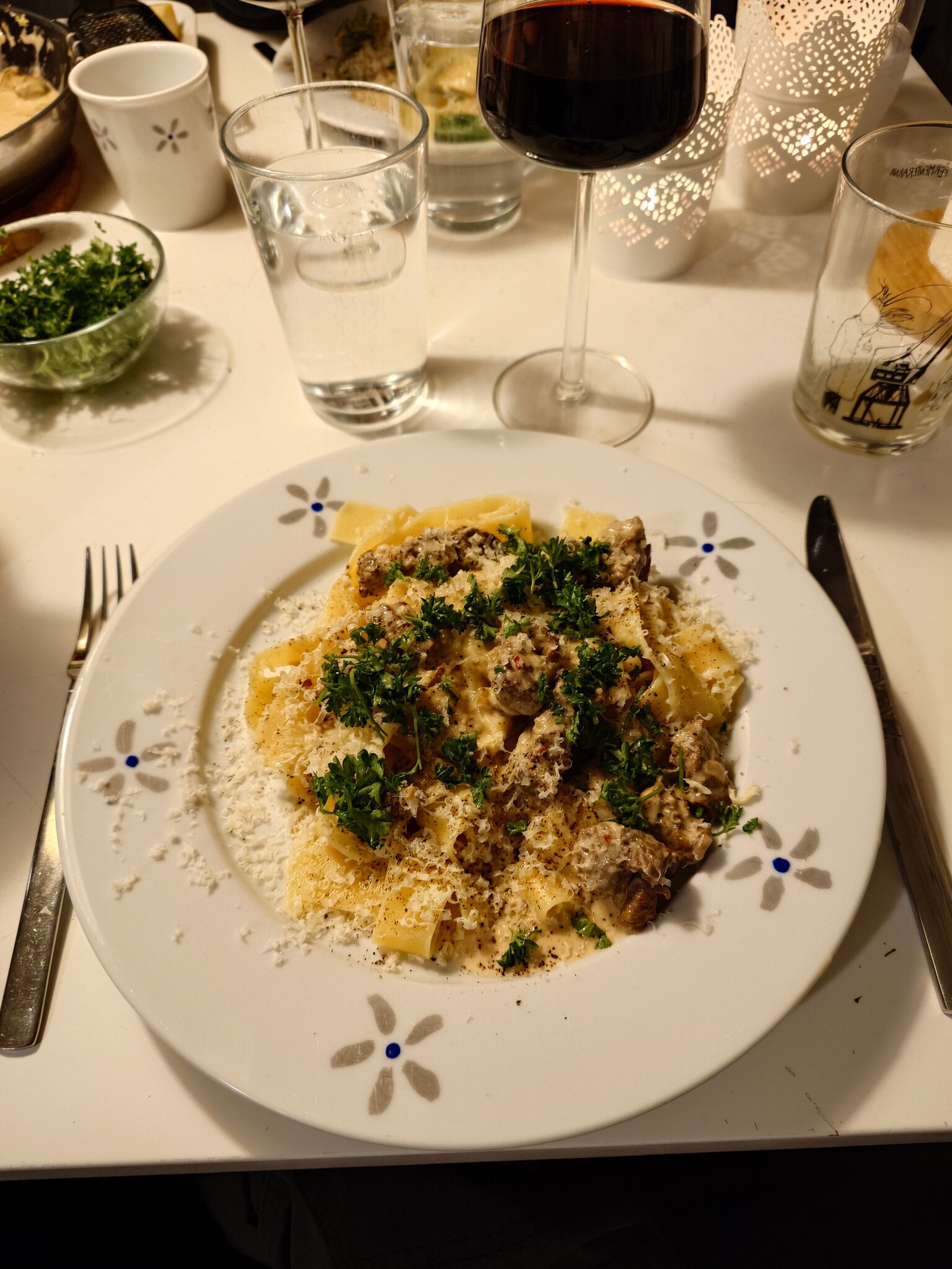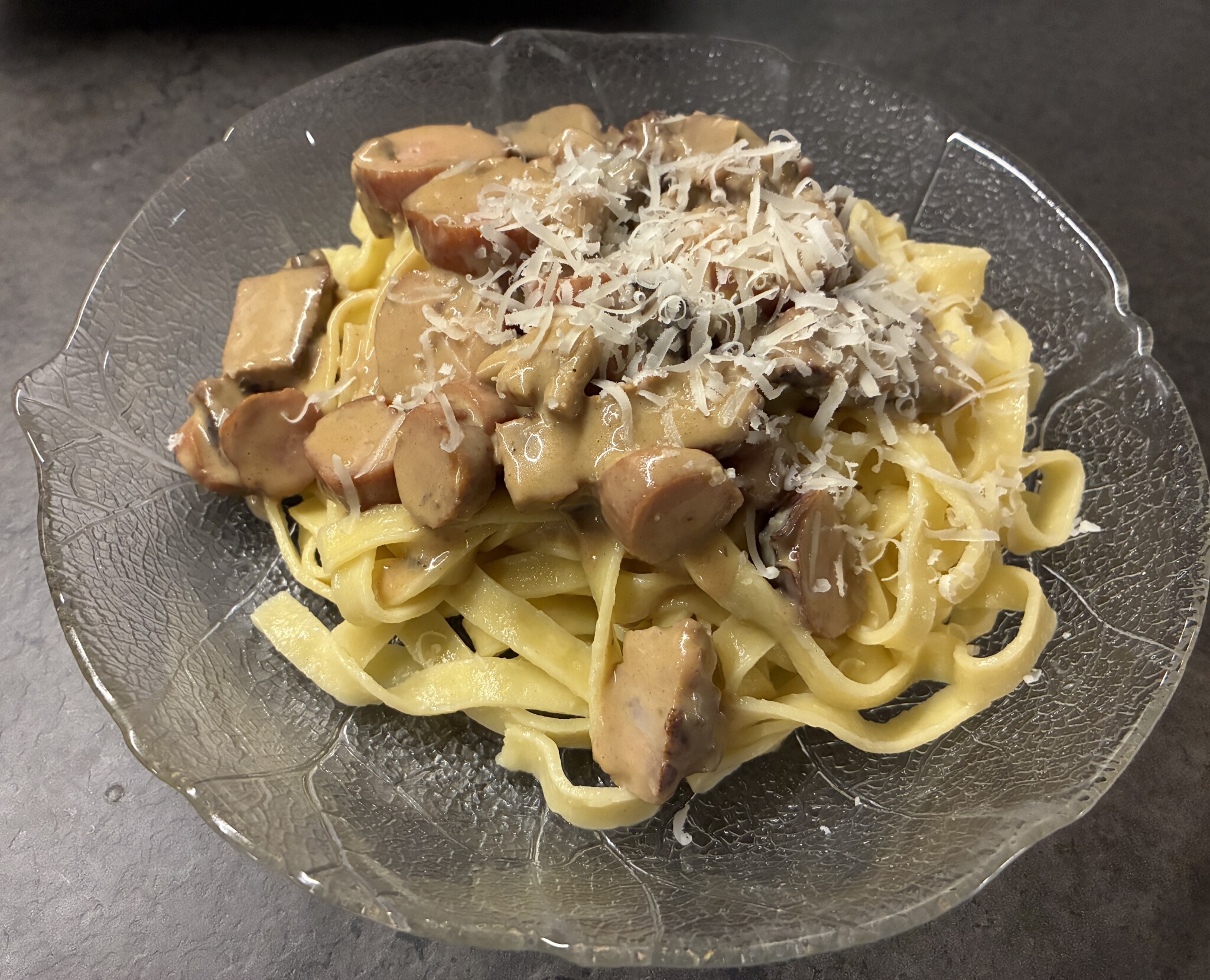 Detta lades på färsk fettucinipasta och toppades med parmesanost.