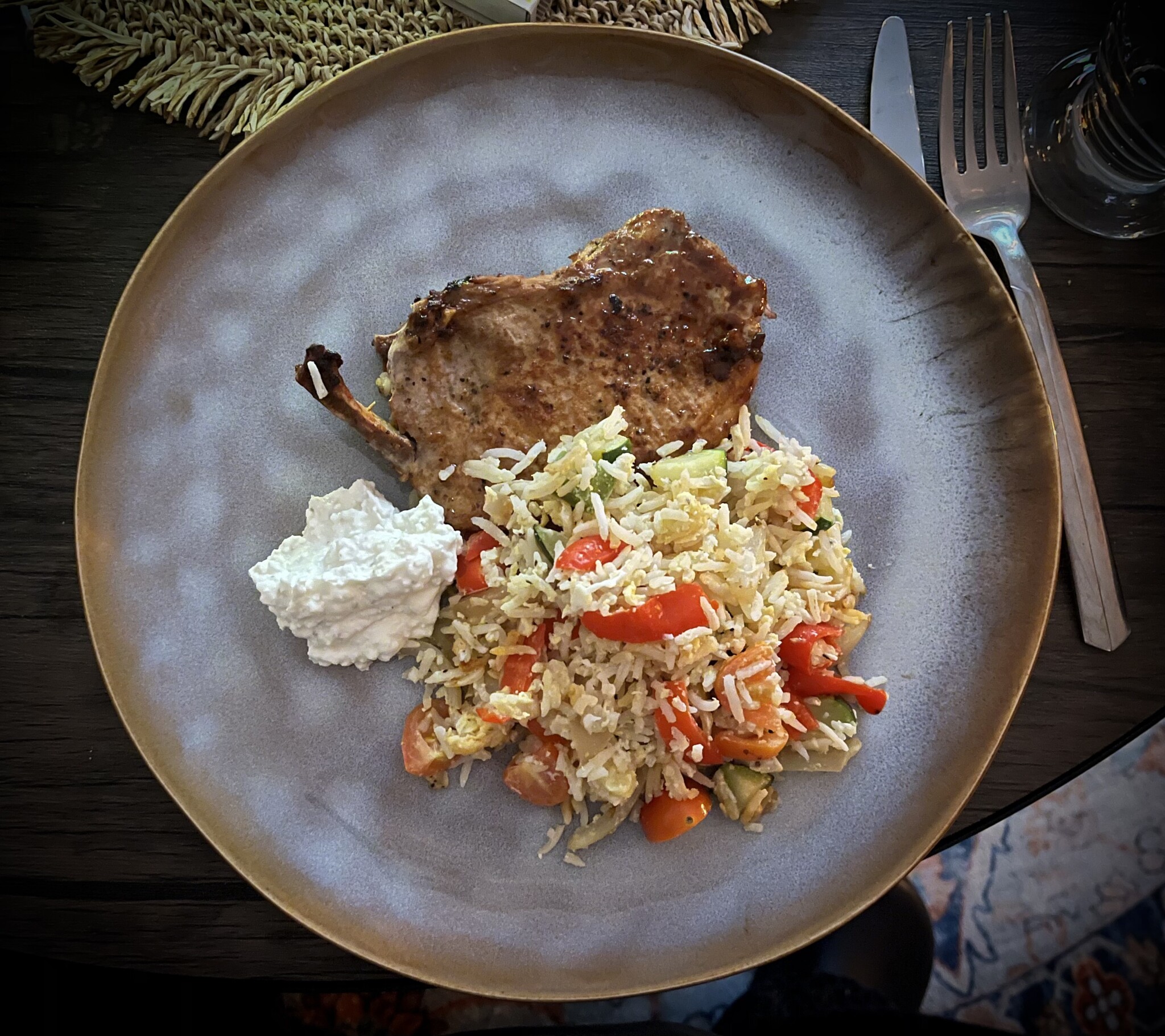 Fläskkotlett med ben, stekt ris/grönsaker (paprika, lök, squash) m ägg... plus en fetaoströra (hade ett par msk cf kvar och en halv fetaost.. mosade ihop dem och hade i lite svartpeppar)