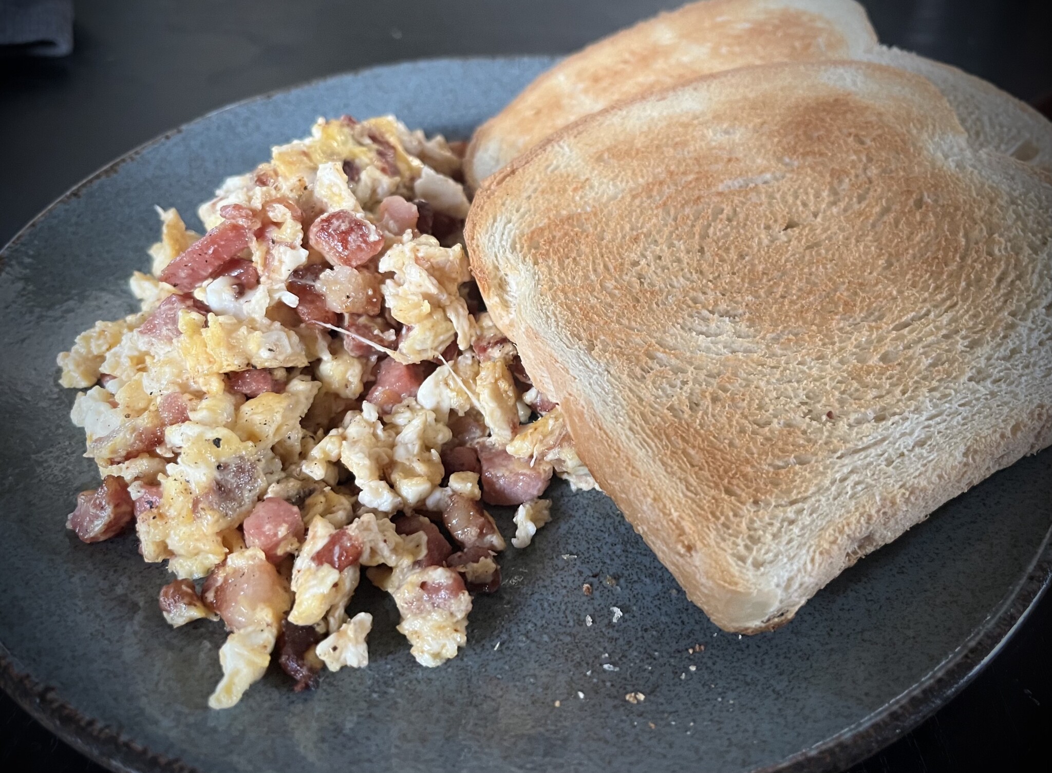 Hade 1/3 förpackning tärnat bacon kvar...sedan förra veckan och tänkte att den passar till frukost (funkar baconskivor, funkar väl bacontärningar?).. sagt och gjort.. scramblade några ägg med.. efter jag stekt baconet lite.. 👍