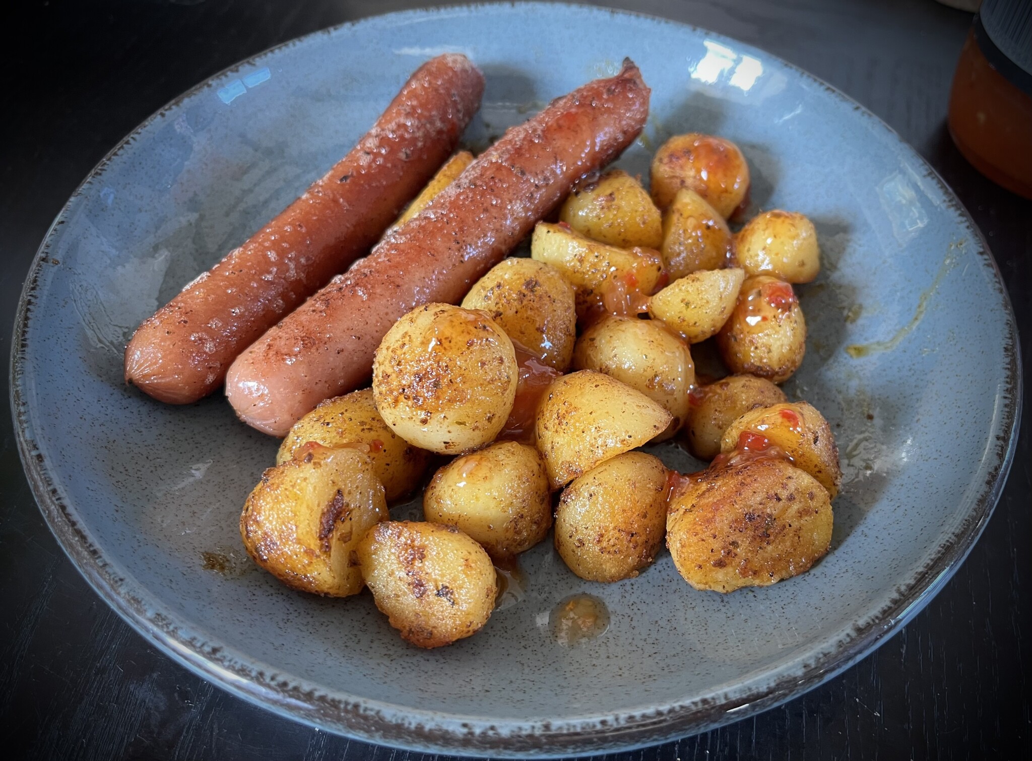 En dag blev det varmkorv och utgången (färdig) kulpotis.. med sweetchili över/på.. (det som glänser lite). Jag är inte så kinkig på datum (vissa saker är jag försiktig med dock).. använder ofta näsan och ögonen..