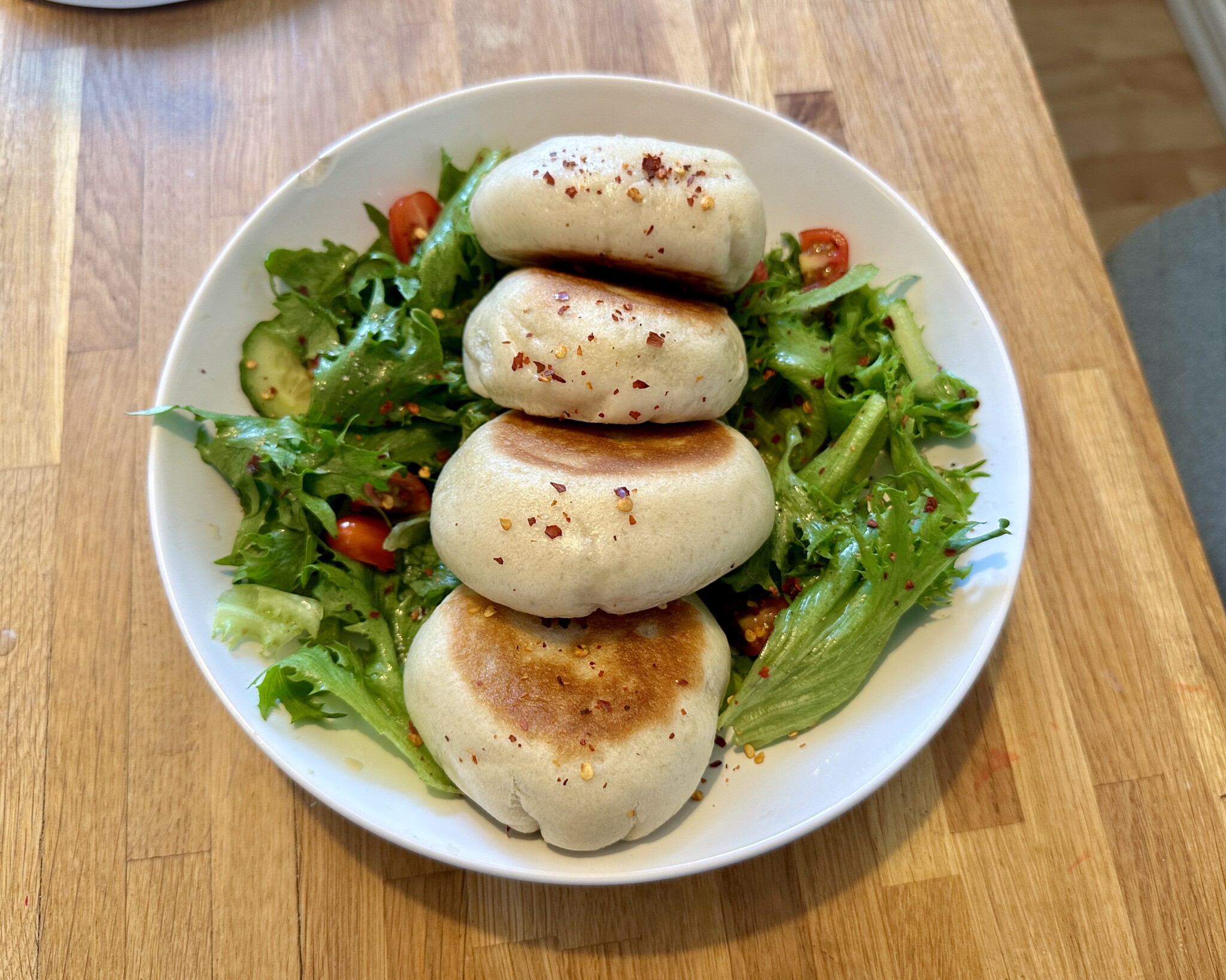Nyss gjort smördegsknyten med rökt lax, salladslök och äggstanning på mozzarella.