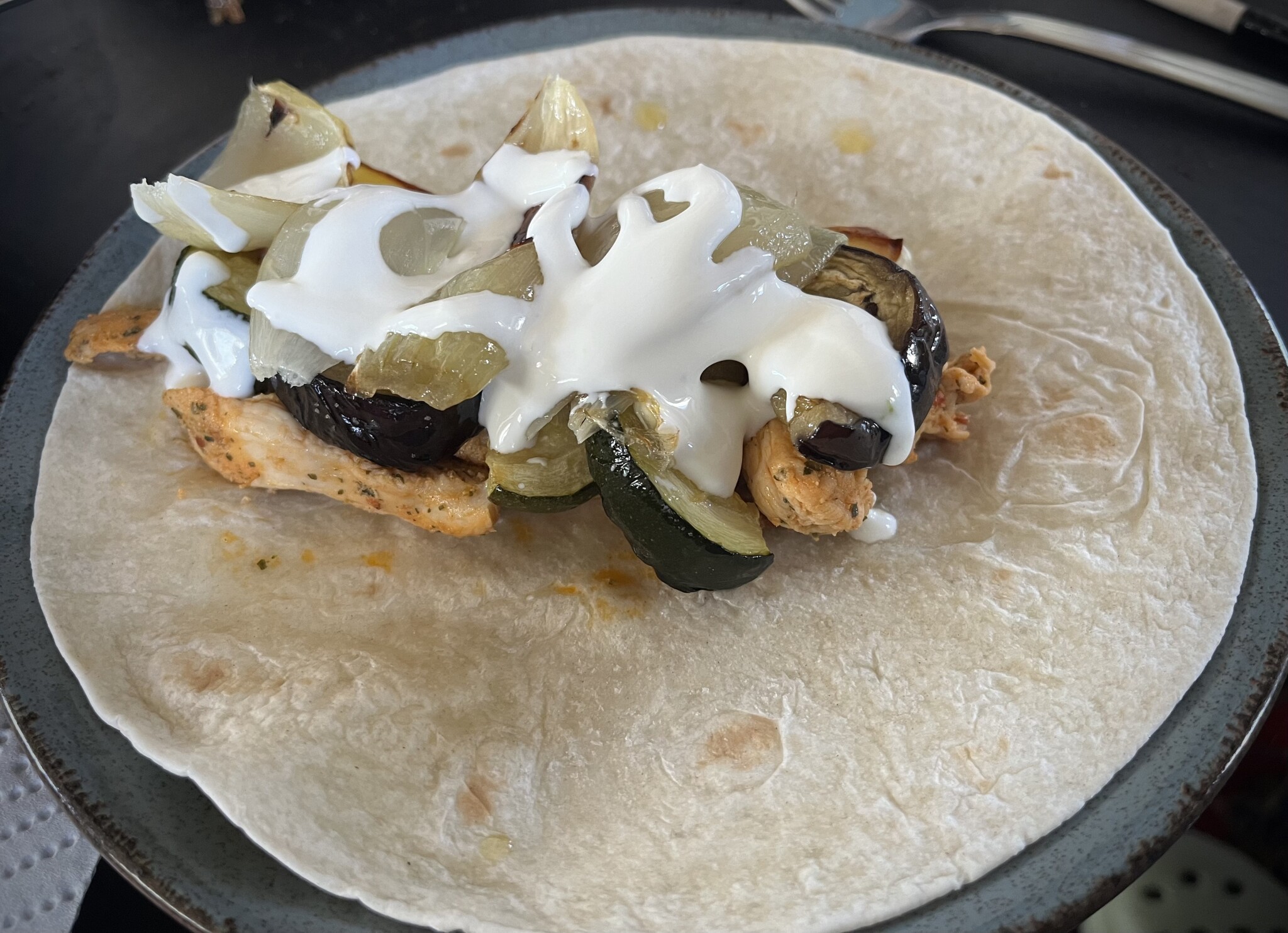 Wrap med kycklingstrimlor.. ugnsrostade grönsaker (aubergine, squash, paprika, lök, vitlök och nån potatis), vitlökssås & hetså# 👍